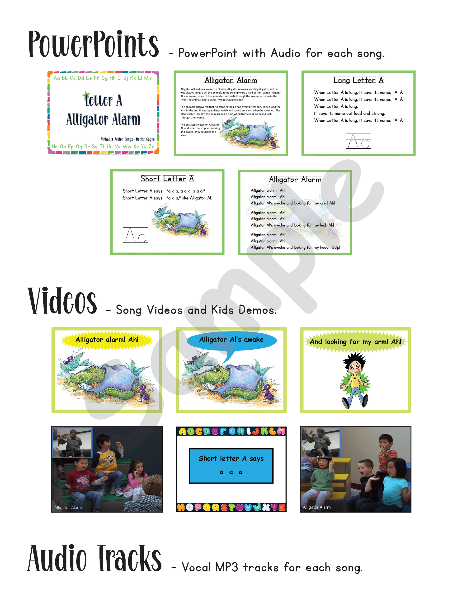 Great for PreK! These songs will have you moving to the beat while you learn the letters of the alphabet. For each letter, a phonics song AND an action song are given. The audios include vocal performances for you to learn the songs, and accompaniment tracks for the action songs so you can perform them in assemblies. Stories about each character and reproducible take-home student pages are included so your students can get extra practice. Research has demonstrated that the use of music and movement will really help your students to learn the letters and the sounds that the letter makes. The songs are so much fun that the students won’t know how much they’re learning!