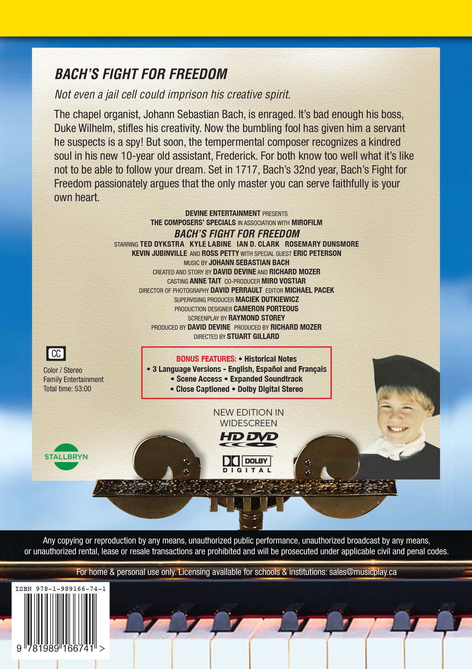 The chapel organist, Johann Sebastian Bach, is enraged. It’s bad enough his boss, Duke Wilhelm, stifles his creativity. Now the bumbling fool has given him a servant he suspects is a spy! But soon, the temperamental composer recognizes a kindred soul in his new 10-year old assistant, Frederick. For both know too well what it’s like not to be able to follow your dream. Set in 1717, Bach’s 32nd year, Bach’s Fight for Freedom passionately argues that the only master you can serve faithfully is your own heart.