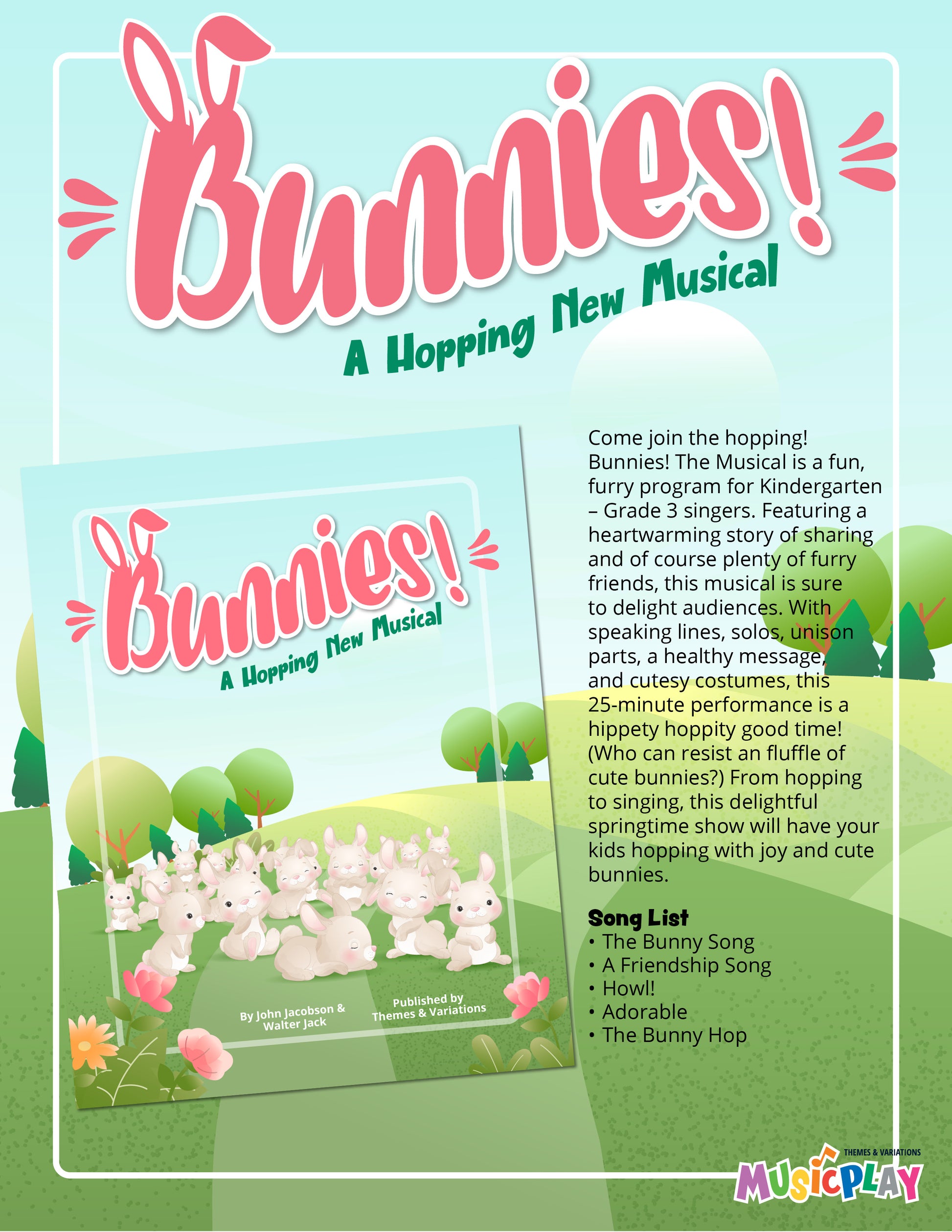 Come join the hopping! Bunnies! This Musical by John Jacobson is a fun, furry program for Kindergarten – Grade 3 singers. Featuring a heartwarming story of sharing and of course plenty of furry friends, this musical is sure to delight audiences. With speaking lines, solos, unison parts, a healthy message, and cutesy costumes, this 25-minute performance is a hippety hoppity good time! (Who can resist an fluffle of cute bunnies?)