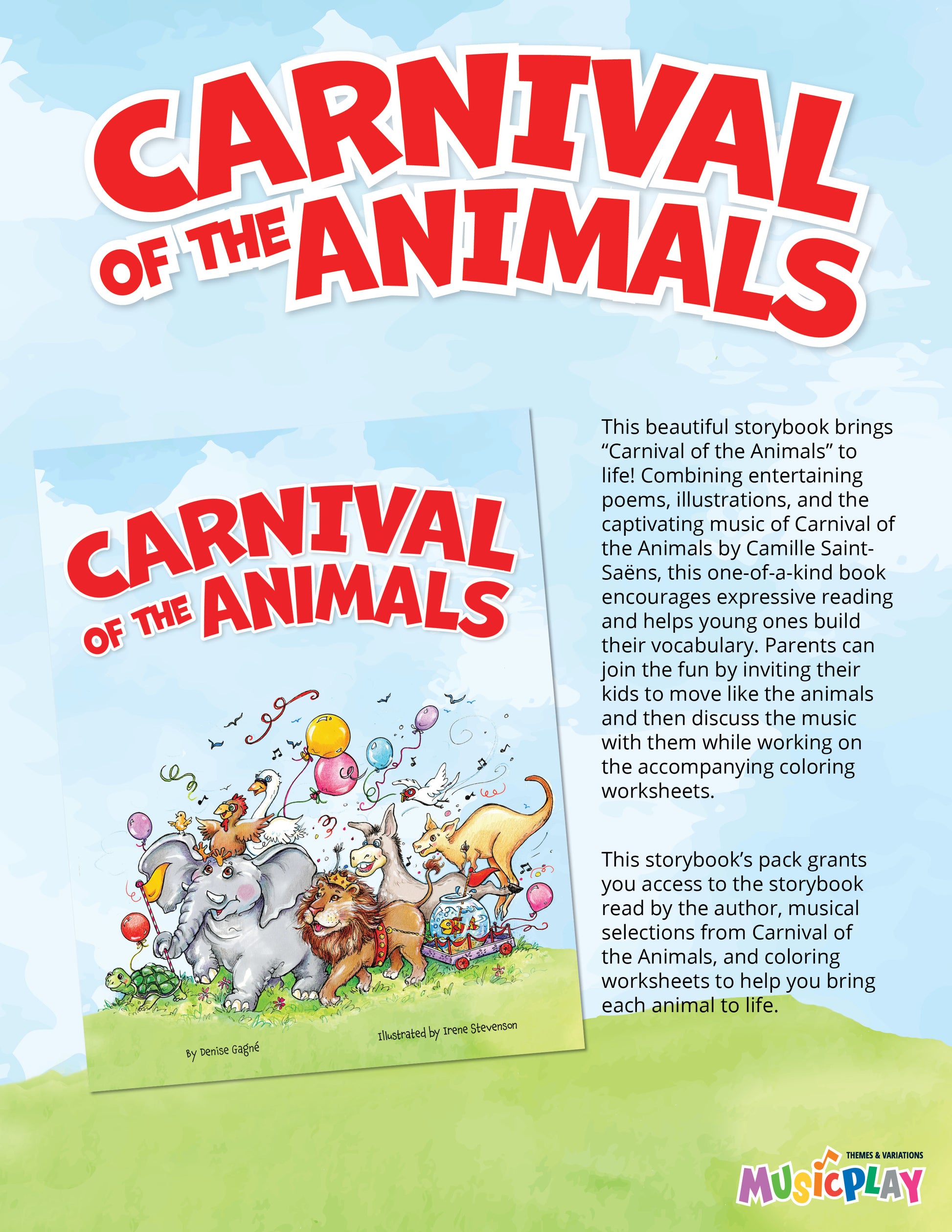 This beautiful storybook brings "Carnival of the Animals" to life! Combining entertaining poems, illustrations, and the captivating music of Carnival of the Animals by Camille Saint-Saëns, this one-of-a-kind book encourages expressive reading and helps young ones build their vocabulary. Parents can join the fun by inviting their kids to move like the animals and then discuss the music with them while working on the accompanying coloring worksheets.