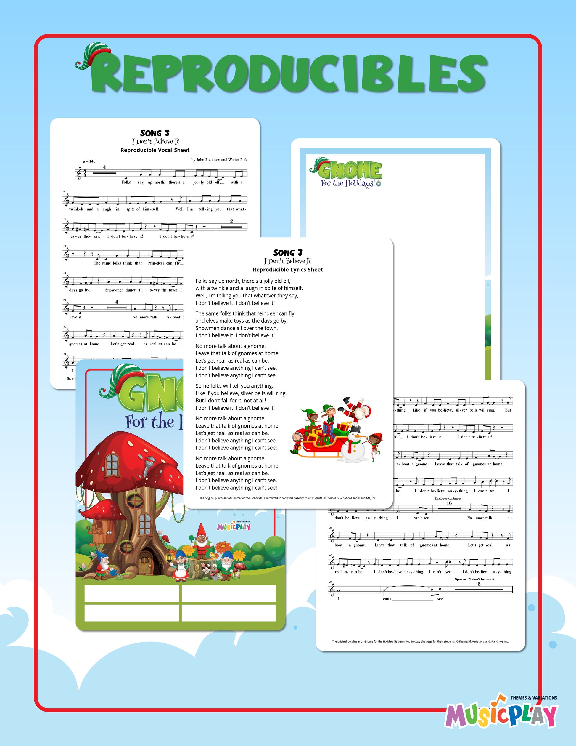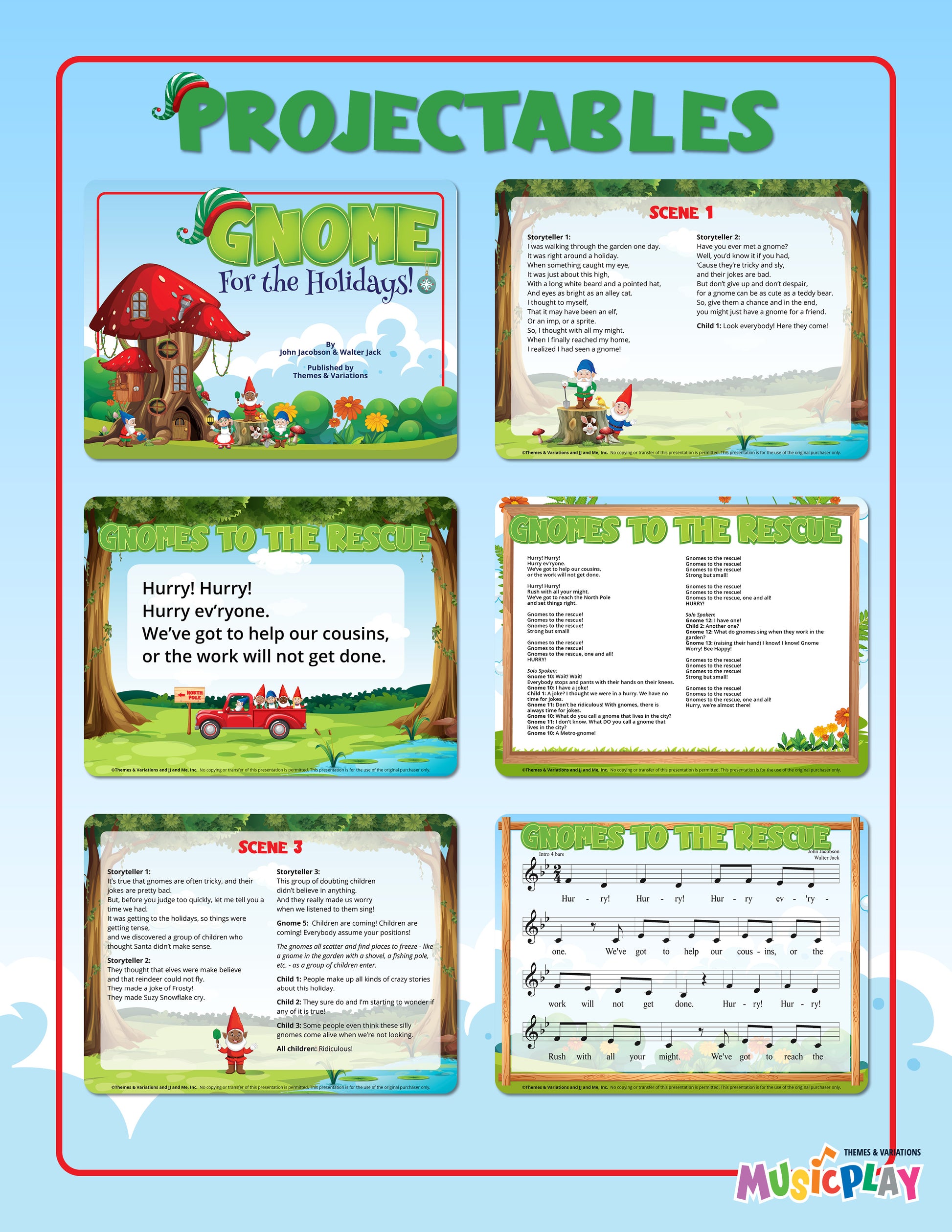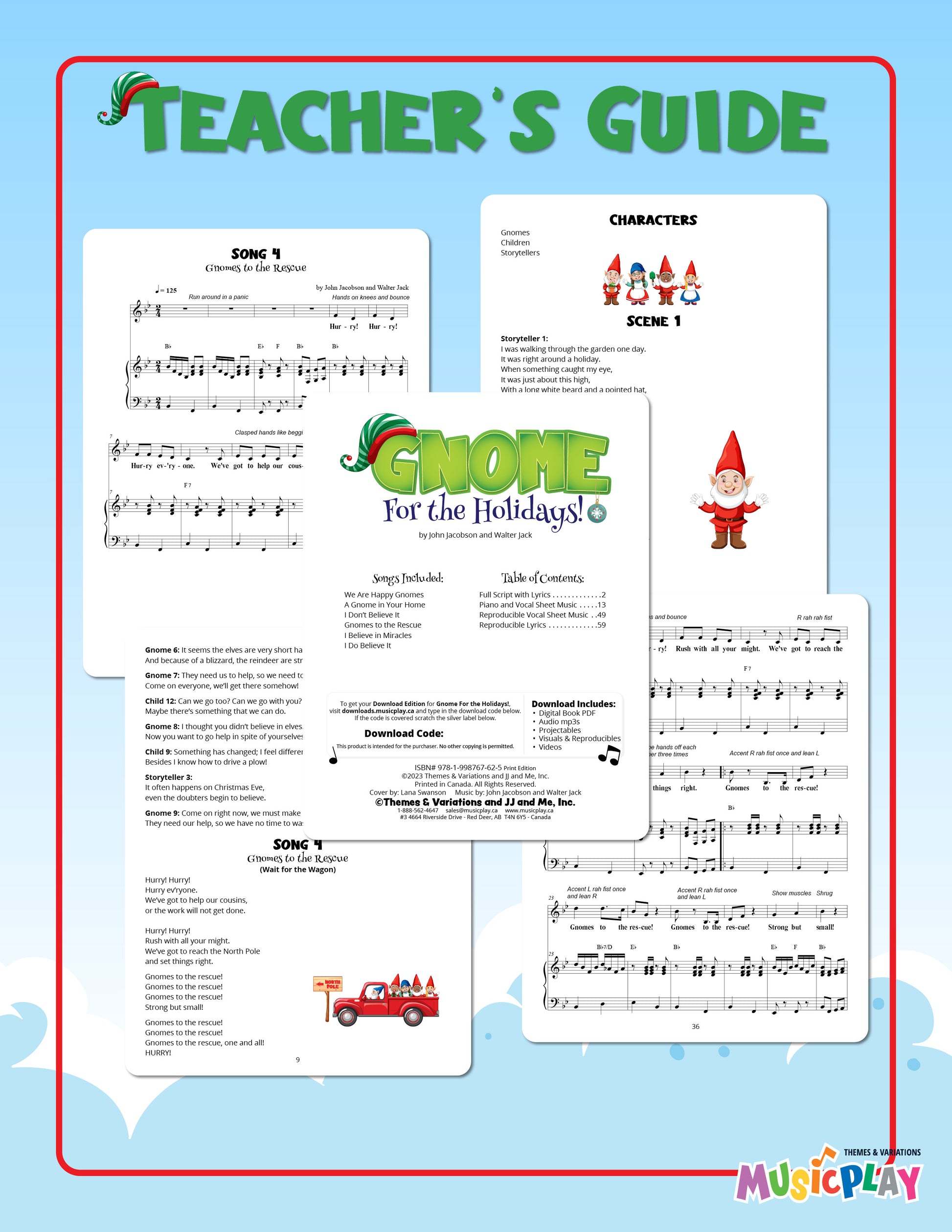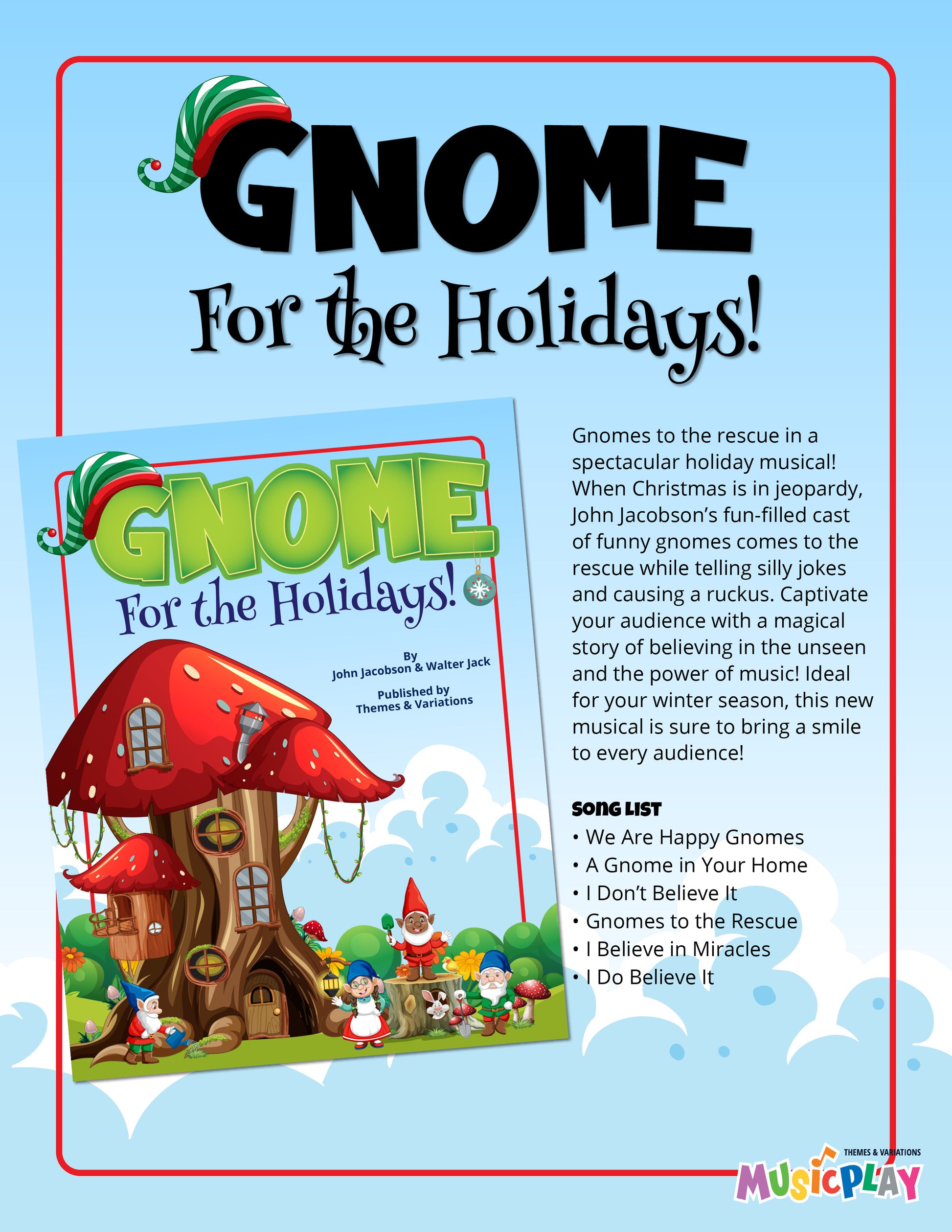Gnomes to the rescue in a spectacular holiday musical! When Christmas is in jeopardy, John Jacobson's fun-filled cast of funny gnomes comes to the rescue while telling silly jokes and causing a ruckus. Captivate your audience with a magical story of believing in the unseen and the power of music! Ideal for your winter season, this new musical is sure to bring a smile to every audience!