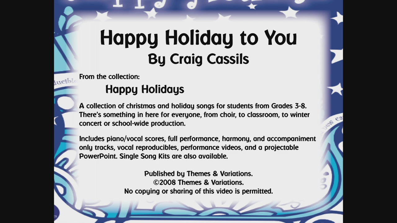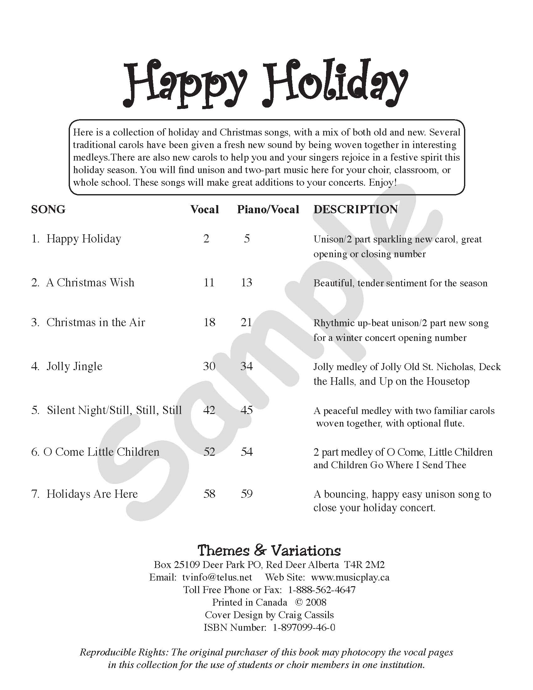 Happy Holidays is a collection of holiday and Christmas songs, with a mix of both old and new. Several traditional carols have been given a fresh new sound by being woven together in interesting medleys. There are also new carols to help you and your singers rejoice in a festive spirit this holiday season. You will find unison and two-part music here for your choir, classroom, or whole school. These songs will make great additions to your concerts. Enjoy!