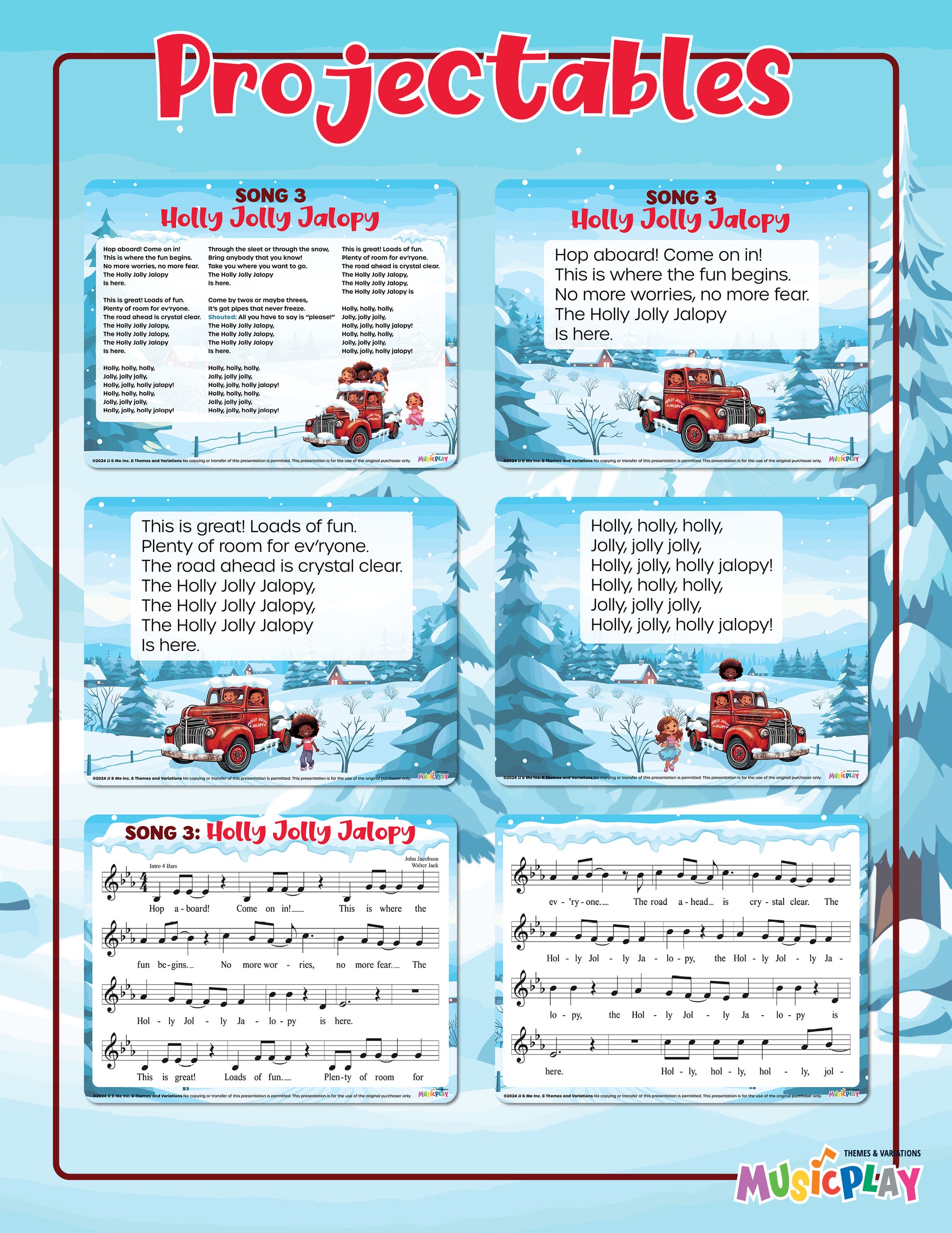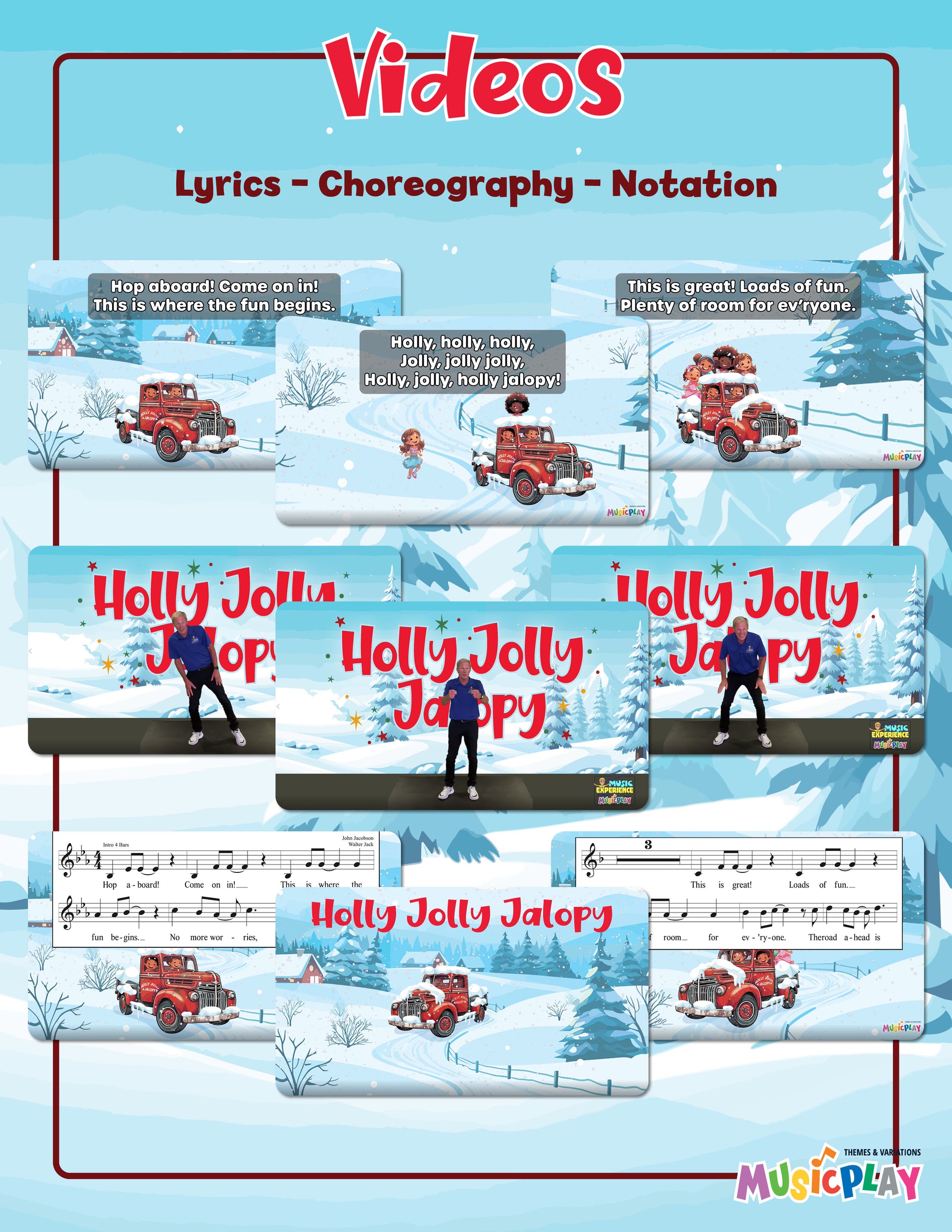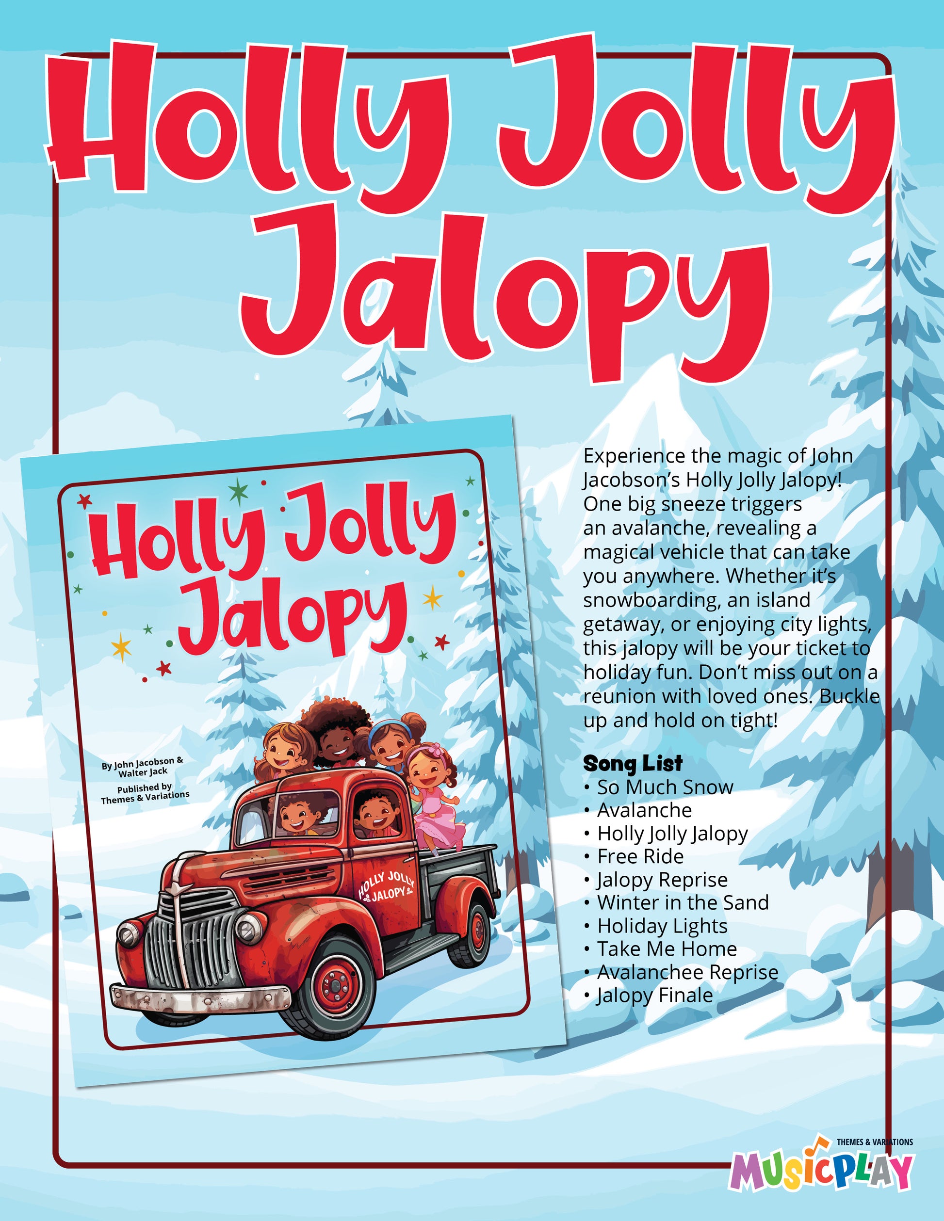 Experience the magic of John Jacobson's Holly Jolly Jalopy! One big sneeze triggers an avalanche, revealing a magical vehicle that can take you anywhere. Whether it's snowboarding, an island getaway, or enjoying city lights, this jalopy will be your ticket to holiday fun. Don't miss out on a reunion with loved ones. Buckle up and hold on tight!