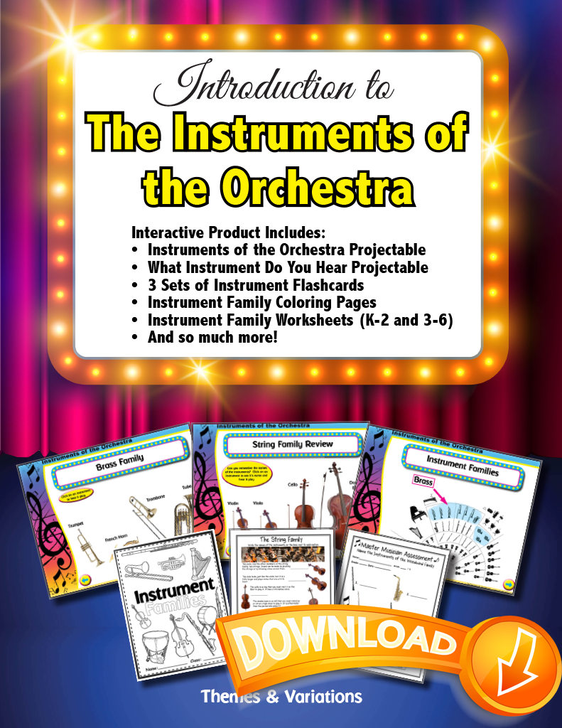 Instruments of the Orchestra is a great resource featuring the instruments of the symphony orchestra for students from K - Gr. 8. Your students will love learning about the instruments of the orchestra, instrument families, and orchestra seating. Your students will learn to identify many orchestral instruments by sight and timbre and be able to sort instruments into instrument families. These activities are a great way for your students to become perceptive listeners with the ability to identify many instruments by sight and by timbre. This resource includes classroom tips and extra game ideas, live recordings of many orchestral instruments, projectables, fun printables, and assessment worksheets.