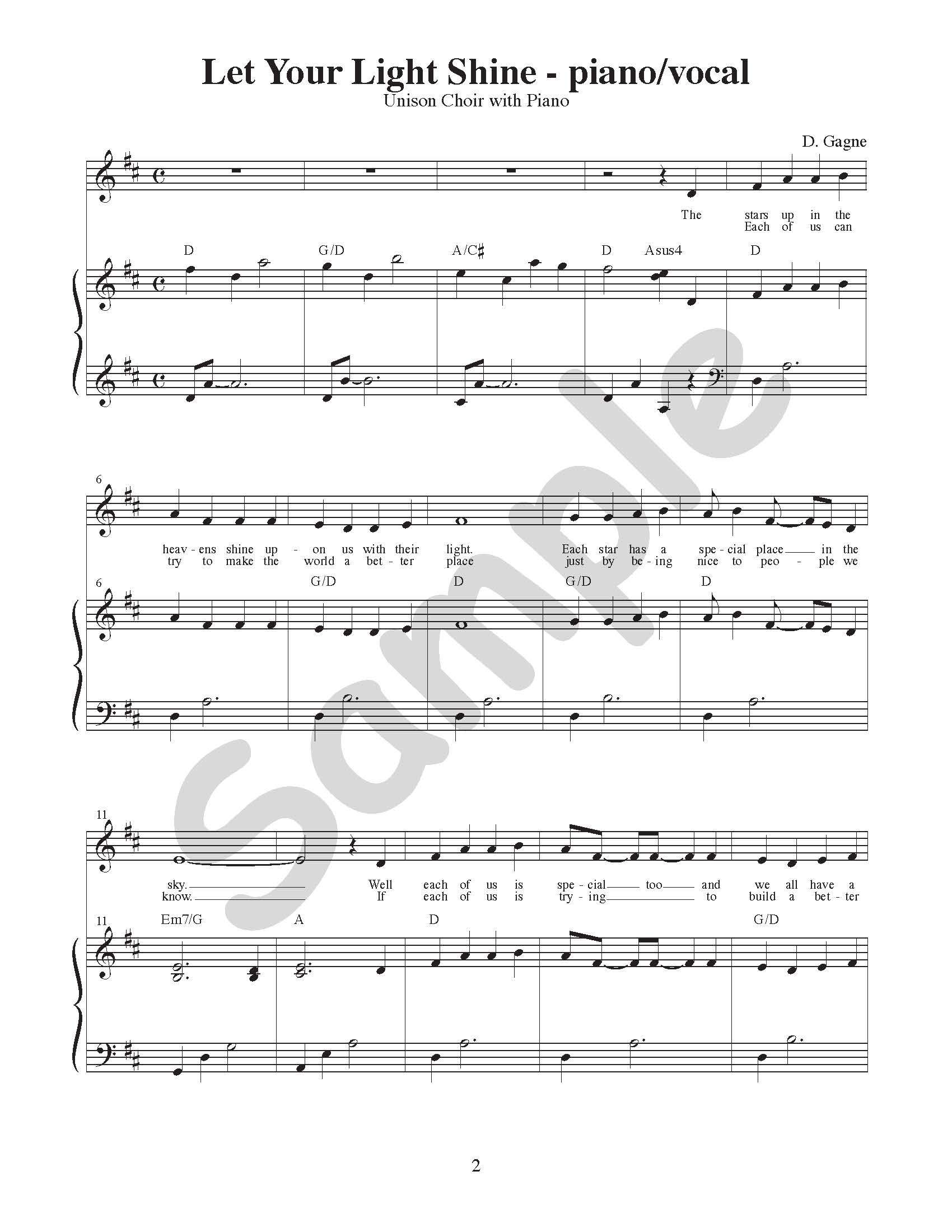 This is a piano/vocal arrangement of Let Your Light Shine by Denise Gagne. This song can also be found in the Musicplay Kindergarten Guitar and Ukulele Arrangements resource.