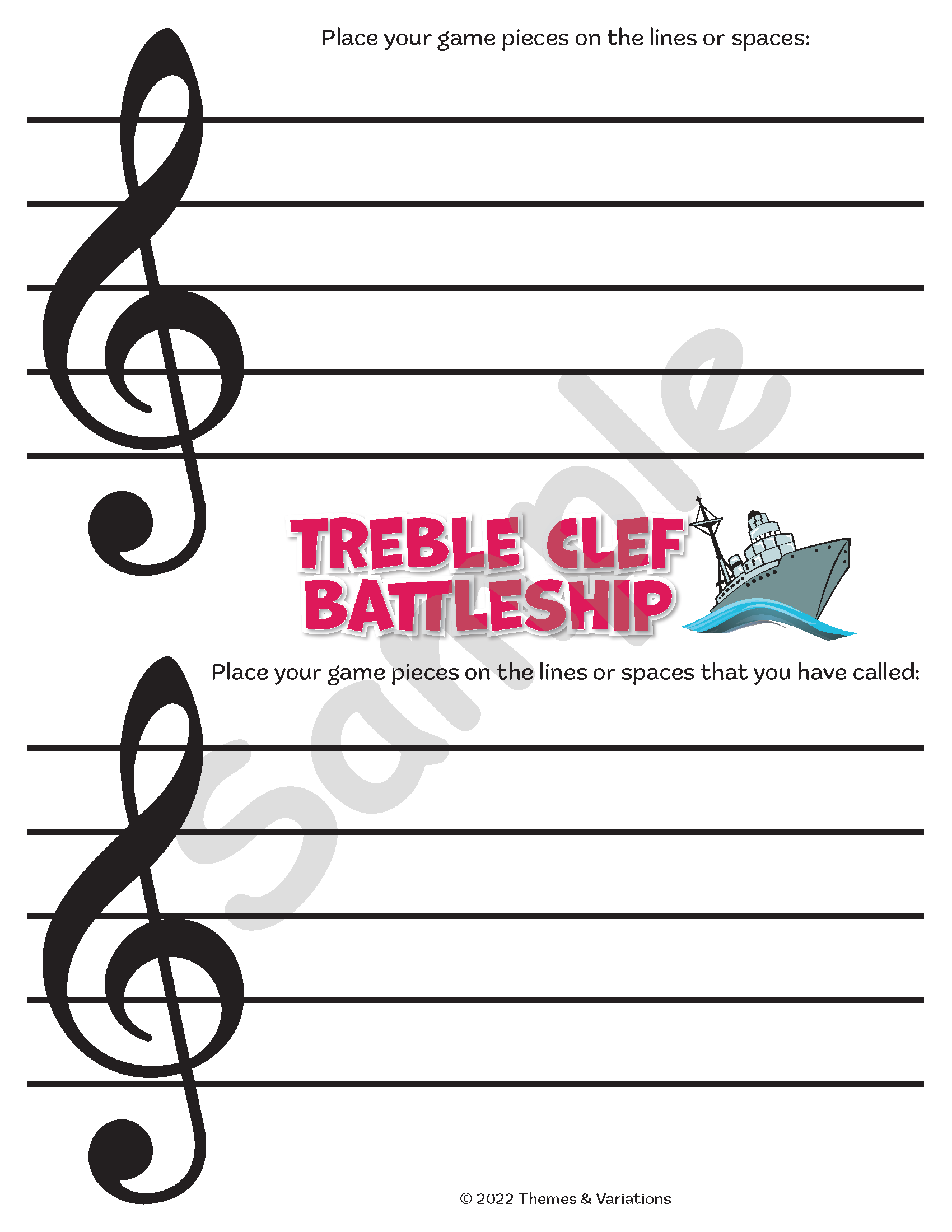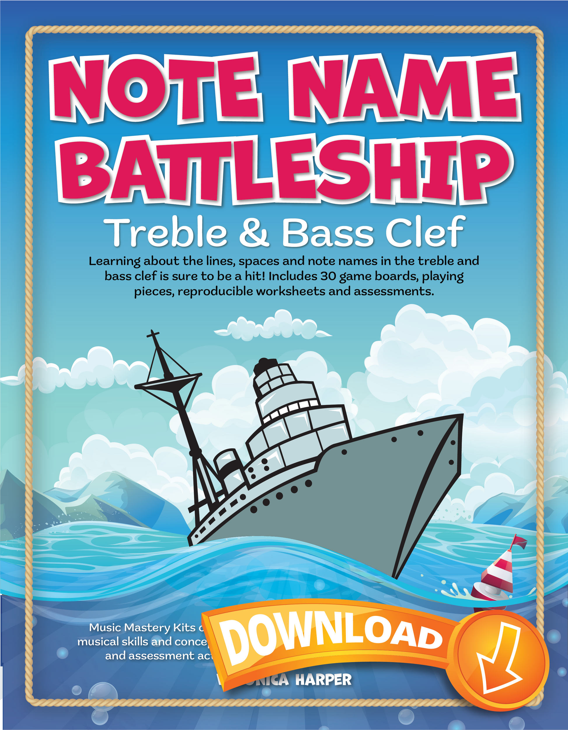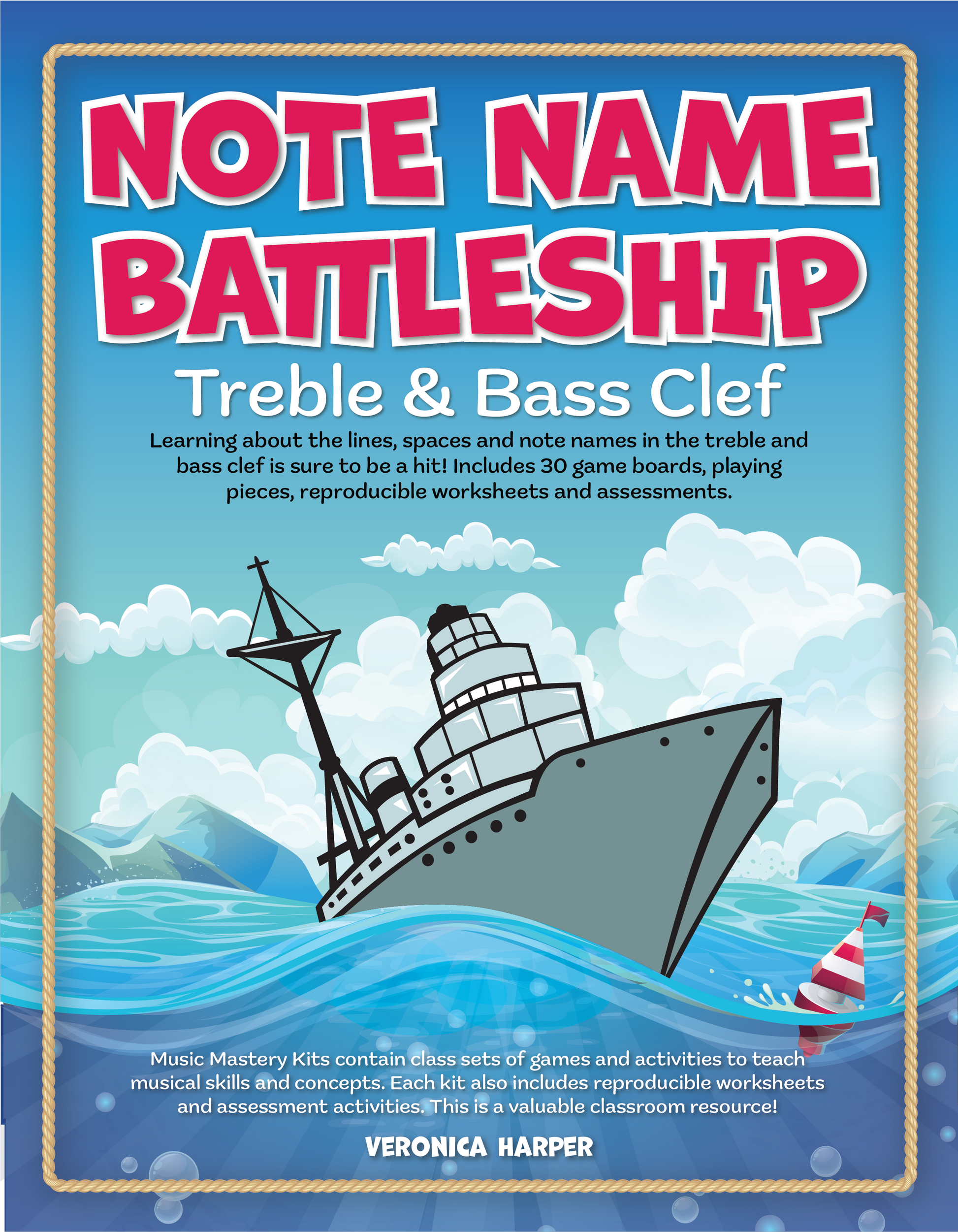 This game is sure to be a hit! Note Name Battleship includes 30 card stock game boards and playing pieces for students to use. Each game card is double-sided which gives the teacher many playing options for students. On one side of the game card there is a treble staff and on the other side is the bass staff. The teacher can choose to use treble or bass clef depending on the ability level of their students. A reproducible Note Name Battleship game has been added to this kit which allows students to practice writing notes on the music staff and add ledger lines for an additional challenge.