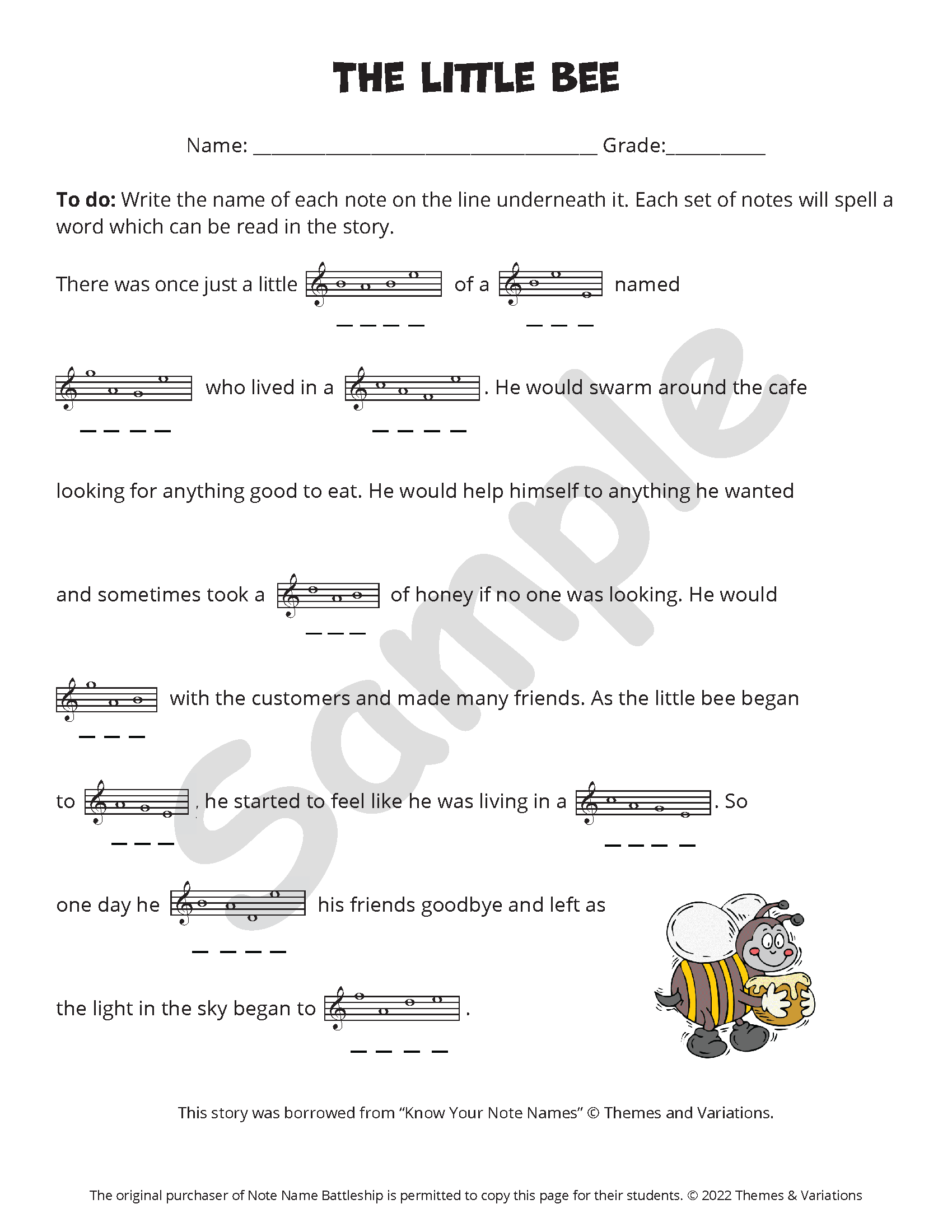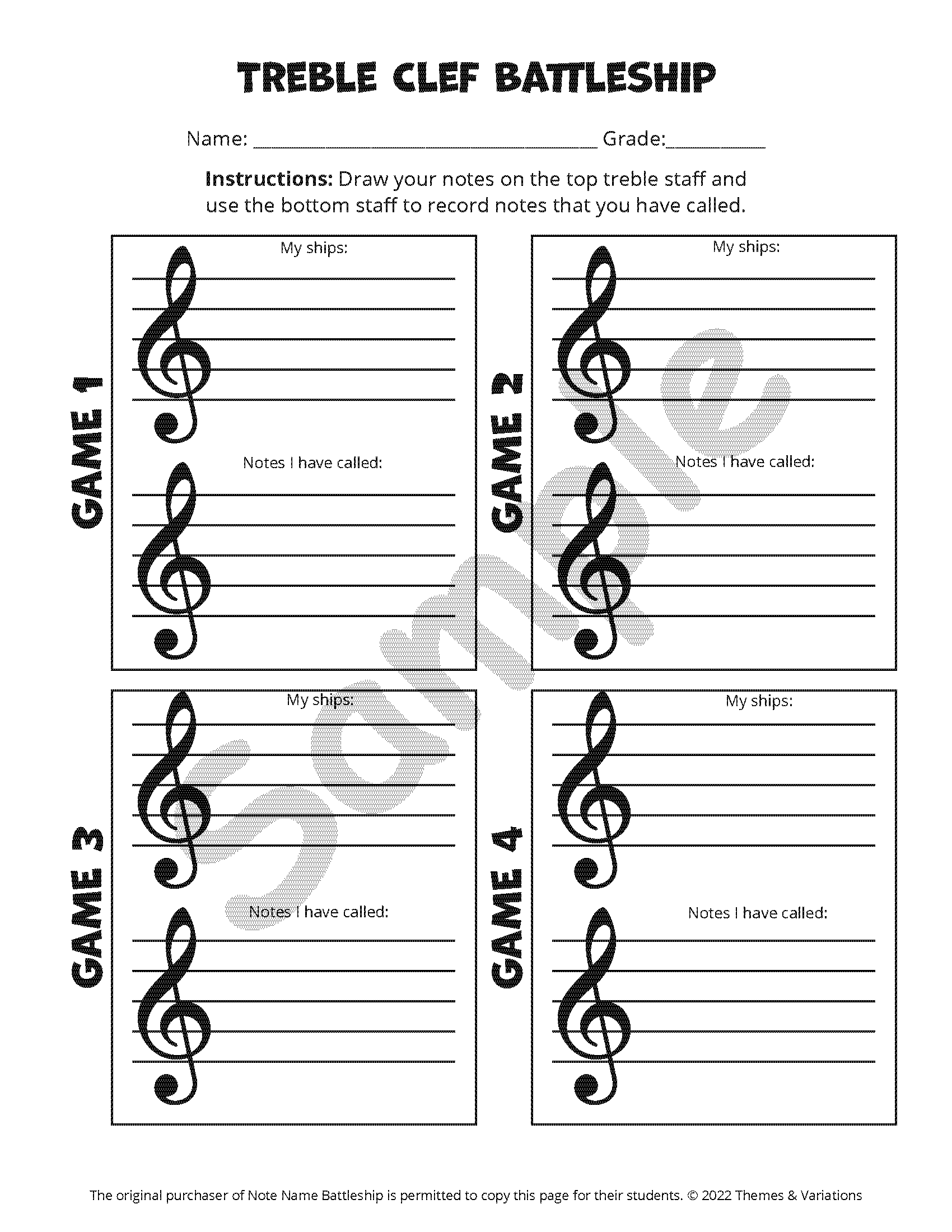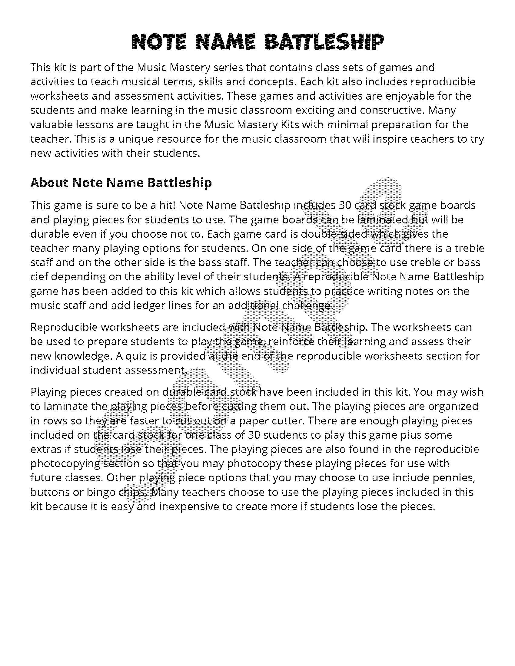 Reproducible worksheets are included with Note Name Battleship. The worksheets can be used to prepare students to play the game, reinforce their learning and assess their new knowledge. A quiz is provided at the end of the reproducible worksheets section for individual student assessment.