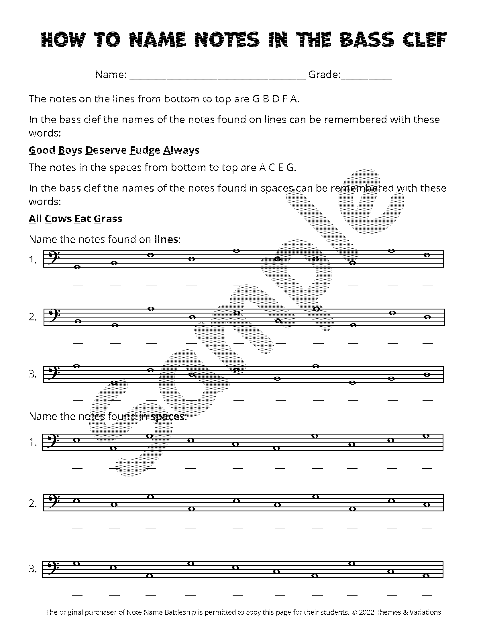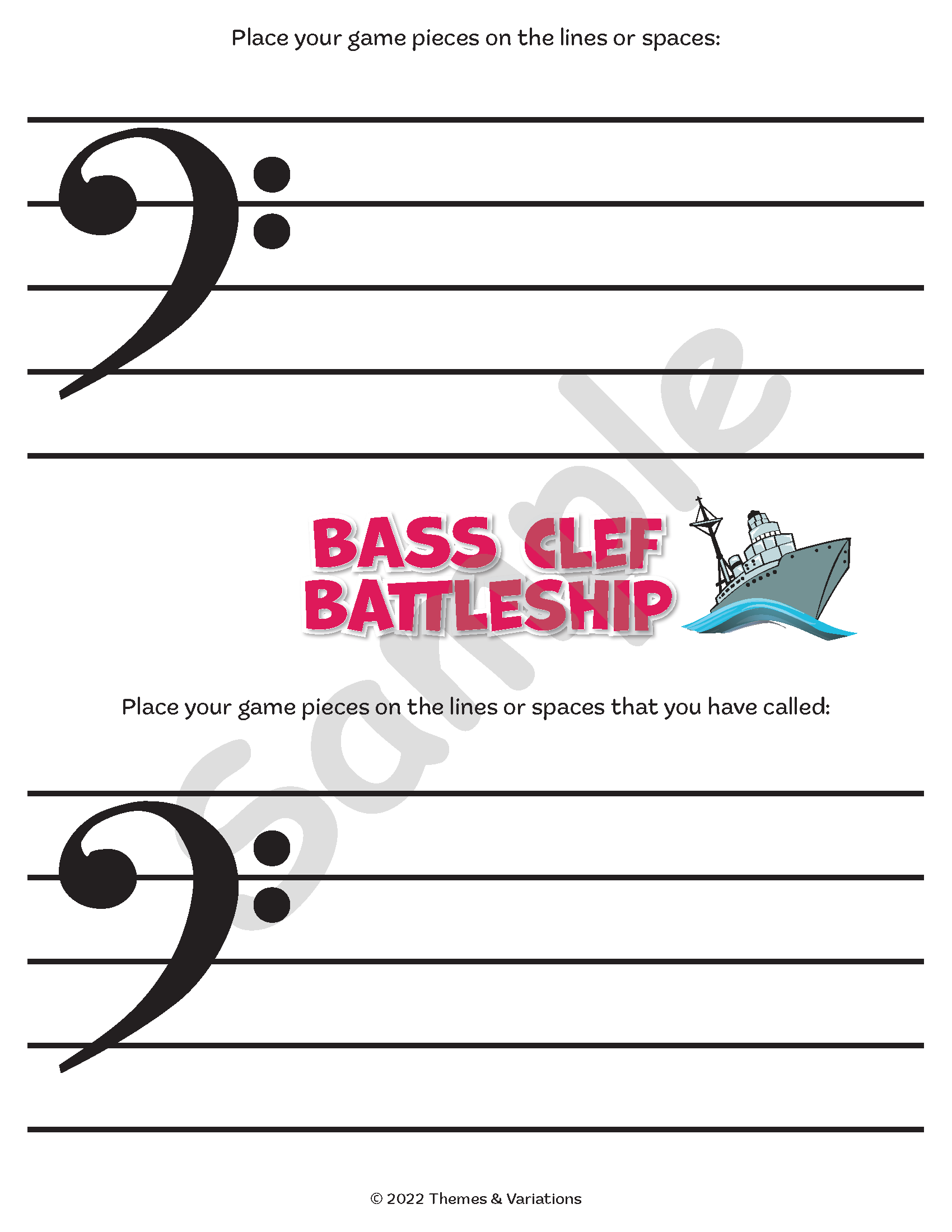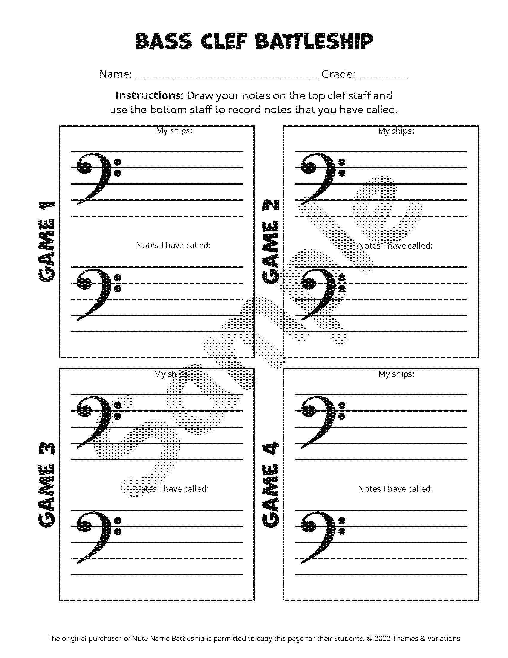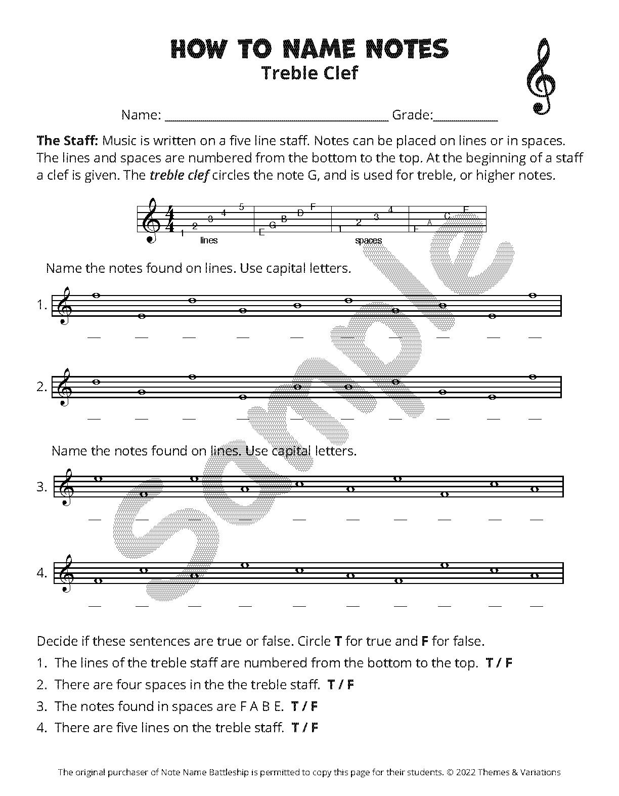 Reproducible worksheets are included with Note Name Battleship. The worksheets can be used to prepare students to play the game, reinforce their learning and assess their new knowledge. A quiz is provided at the end of the reproducible worksheets section for individual student assessment.