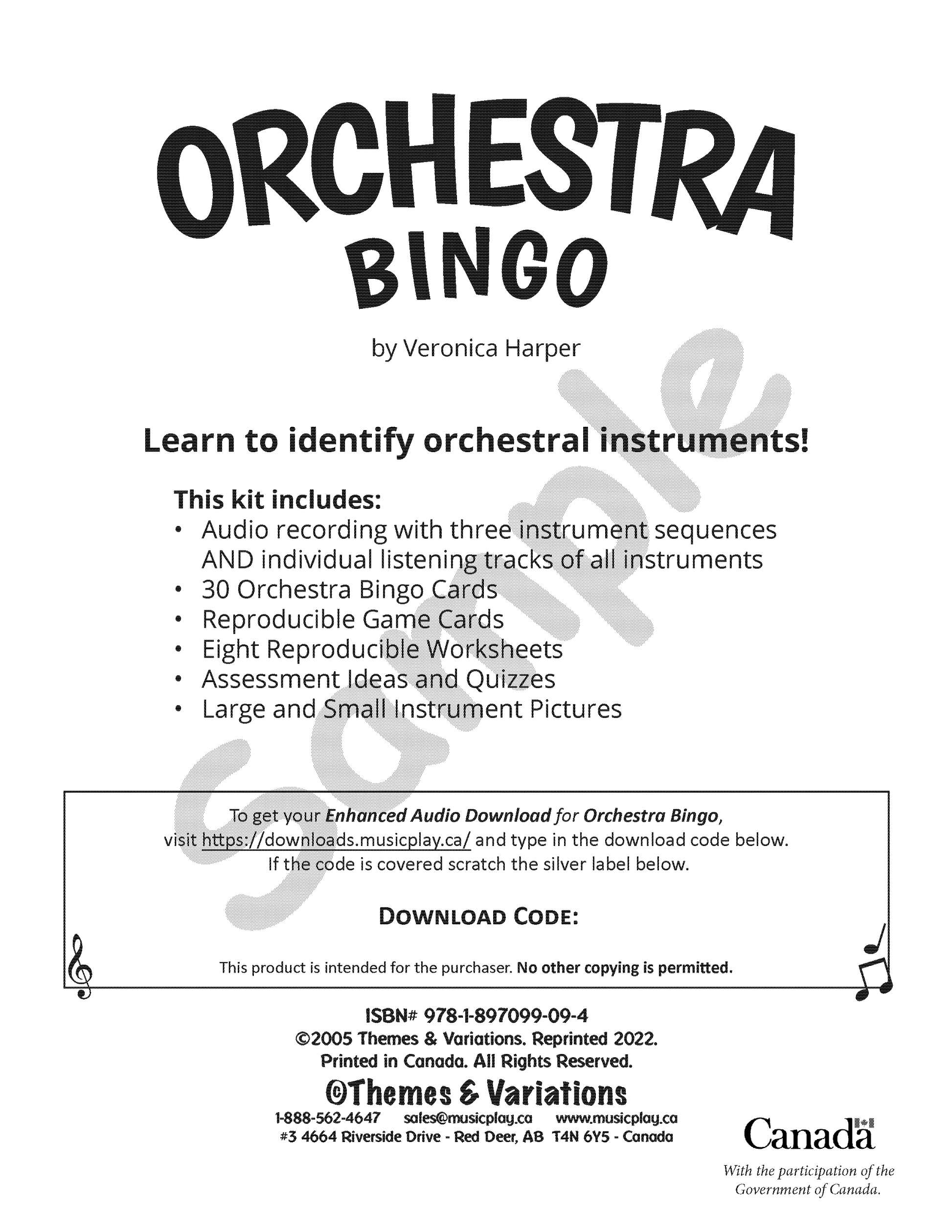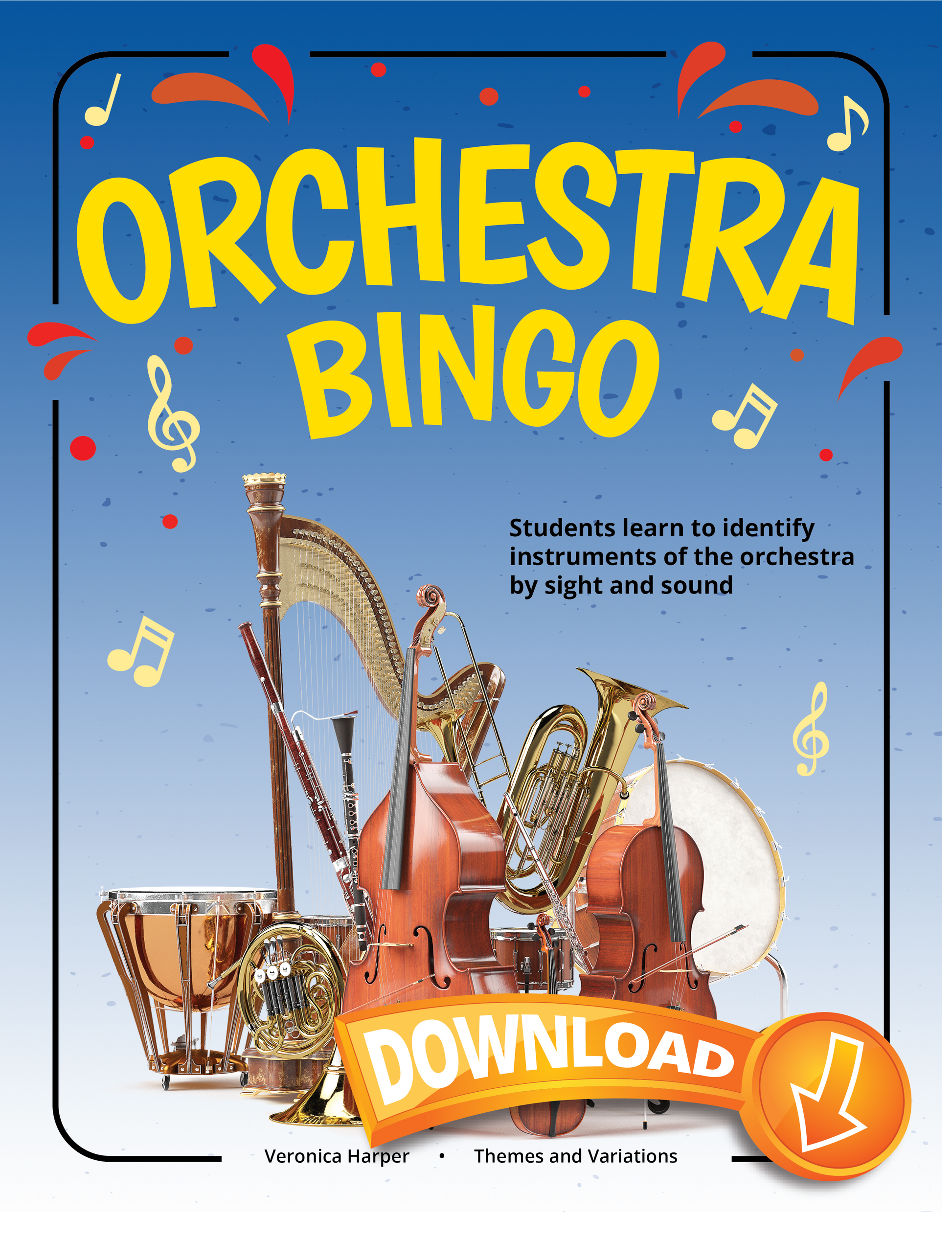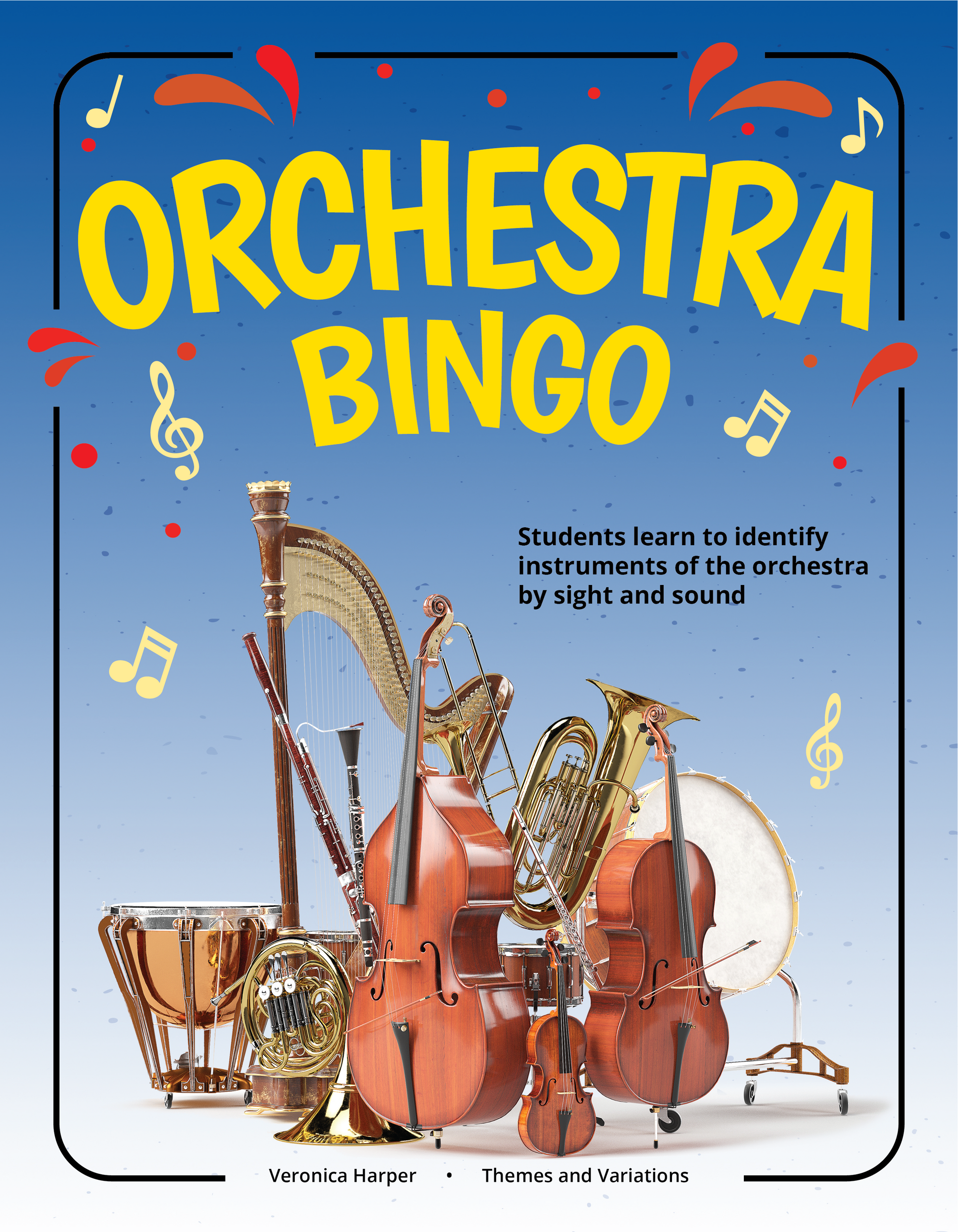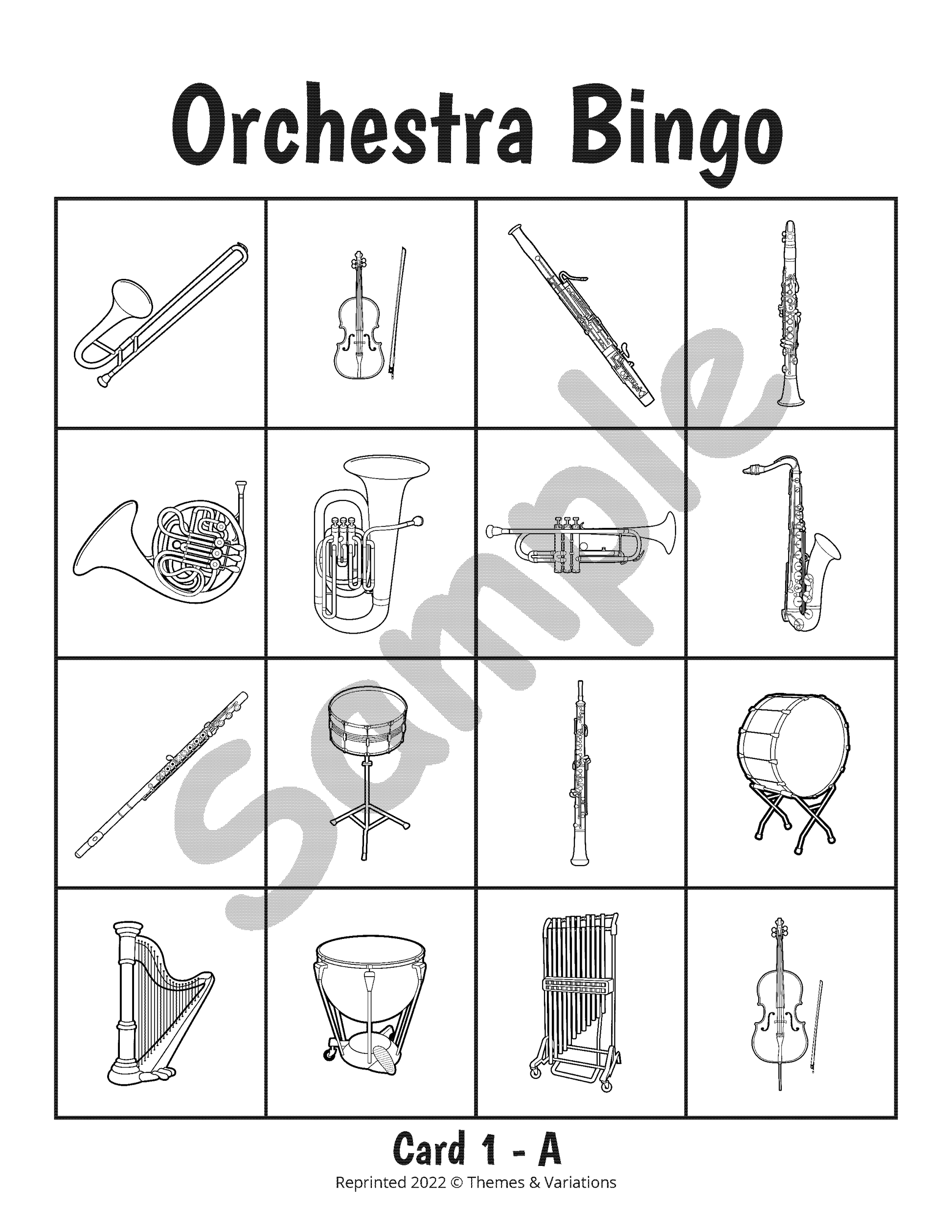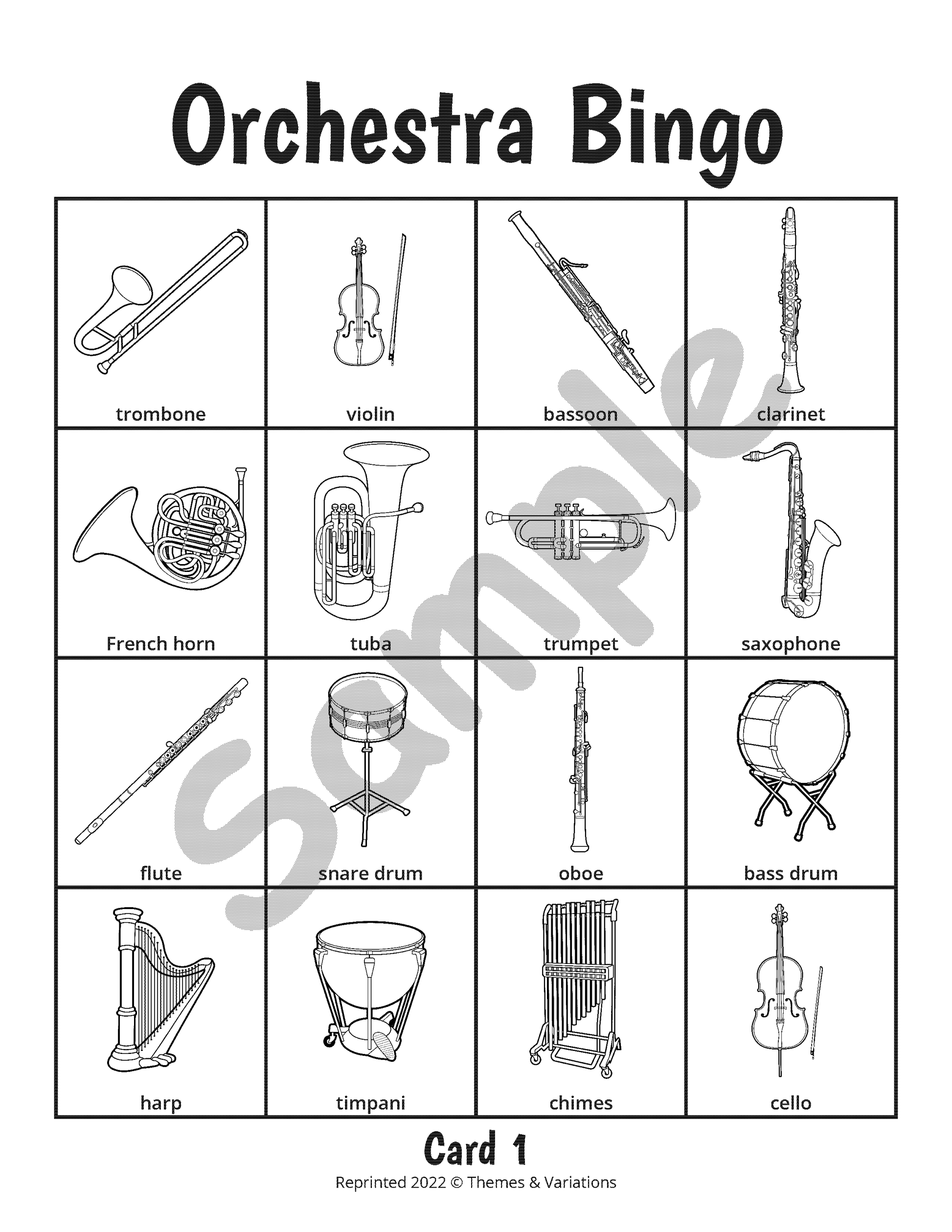 Orchestra Bingo is an exciting way for students to learn to identify many orchestral instruments by sight and sound. The kit includes 30 cardstock game cards, teacher instructions, extra game ideas, and live recordings of many orchestral instruments.
