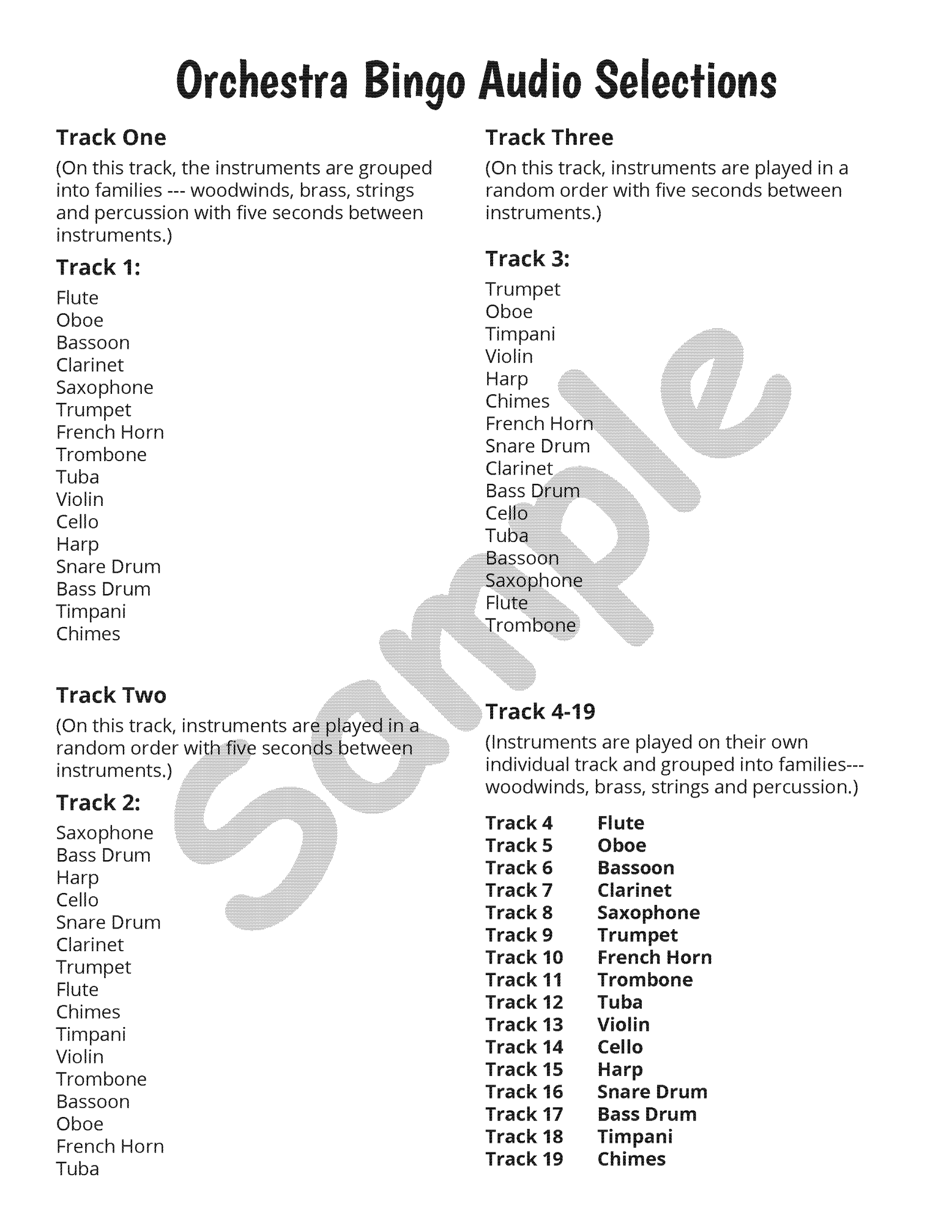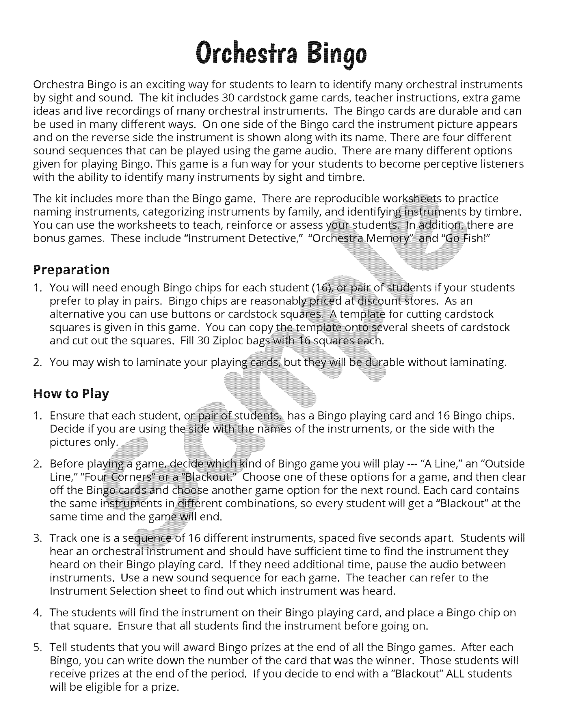 The Bingo cards are durable and can be used in many different ways. On one side of the Bingo card, the instrument picture appears and on the reverse side, the instrument is shown along with its name. There are four different sound sequences that can be played using the recordings. There are many different options given for playing Bingo. This game is a fun way for your students to become perceptive listeners with the ability to identify many instruments by sight and by timbre.
