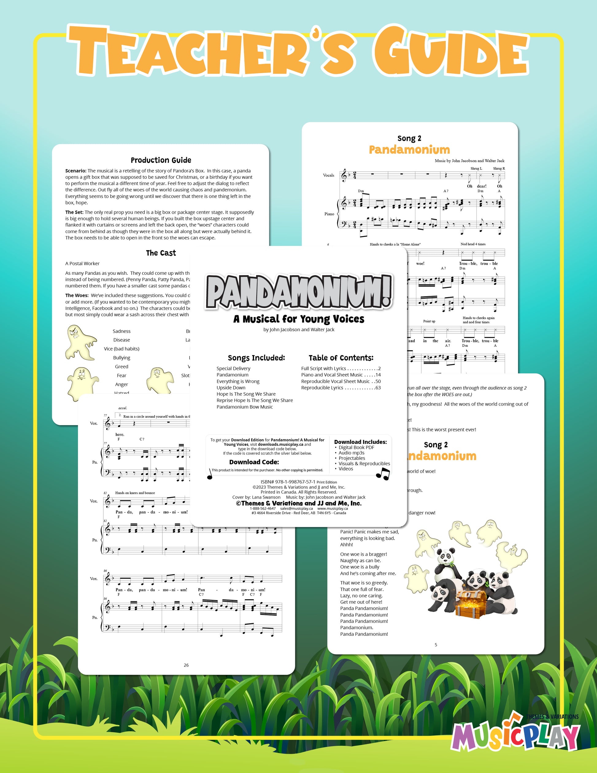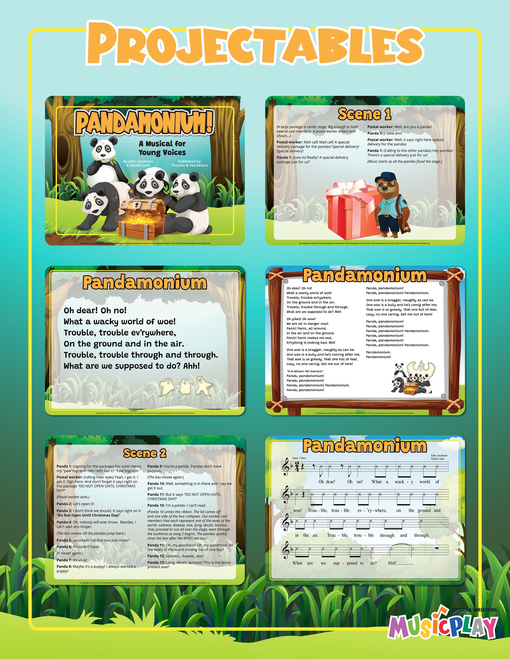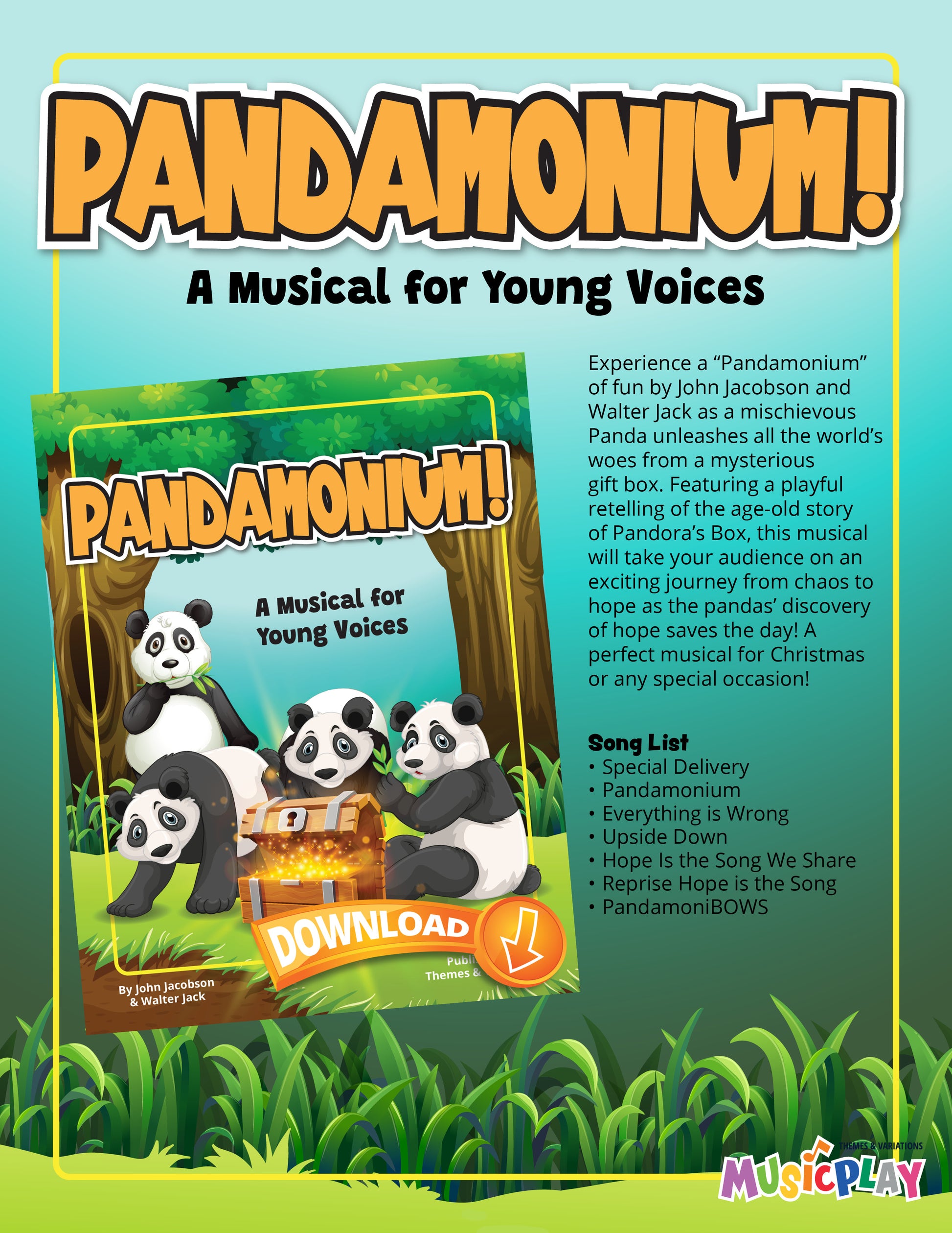 Experience a "Pandamonium" of fun by John Jacobson and Walter Jack as a mischievous Panda unleashes all the world's woes from a mysterious gift box. Featuring a playful retelling of the age-old story of Pandora's Box, this musical will take your audience on an exciting journey from chaos to hope as the pandas’ discovery of hope saves the day! A perfect musical for Christmas or any special occasion!