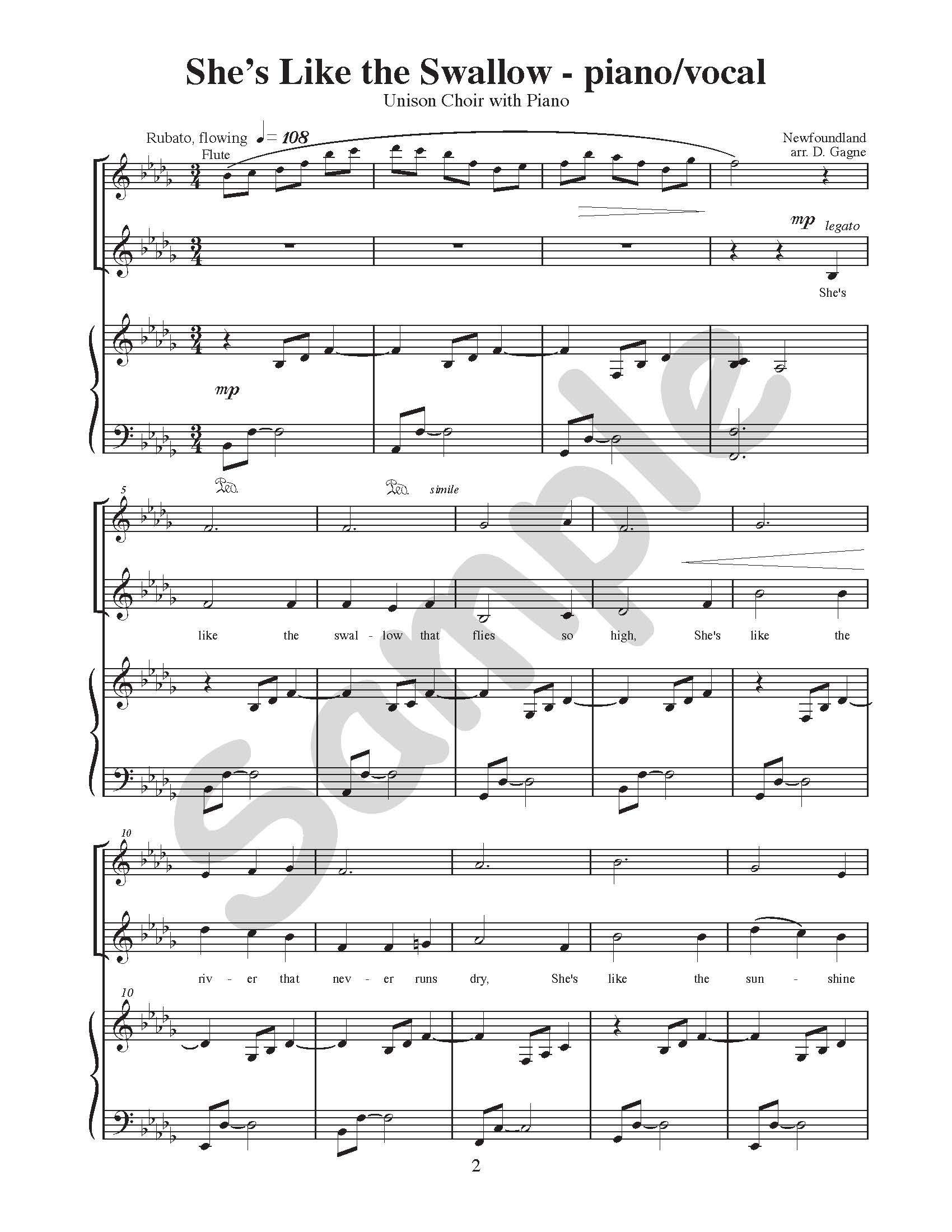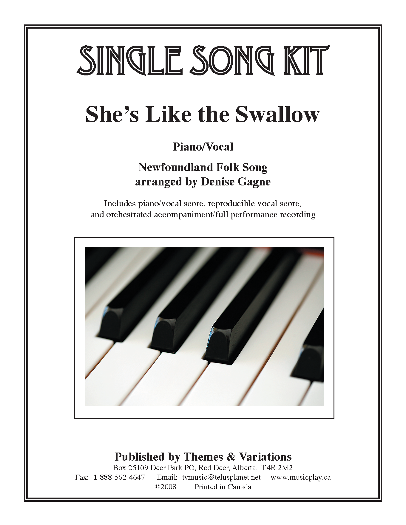 This is a piano/vocal arrangement of She's Like the Swallow, a Newfoundland Folk Song, arranged by Denise Gagne. This song is from the Canadian Folk Songs for Young Voices Volume 2 - SATB Collection, and Sing with the Symphony Volume 1.
