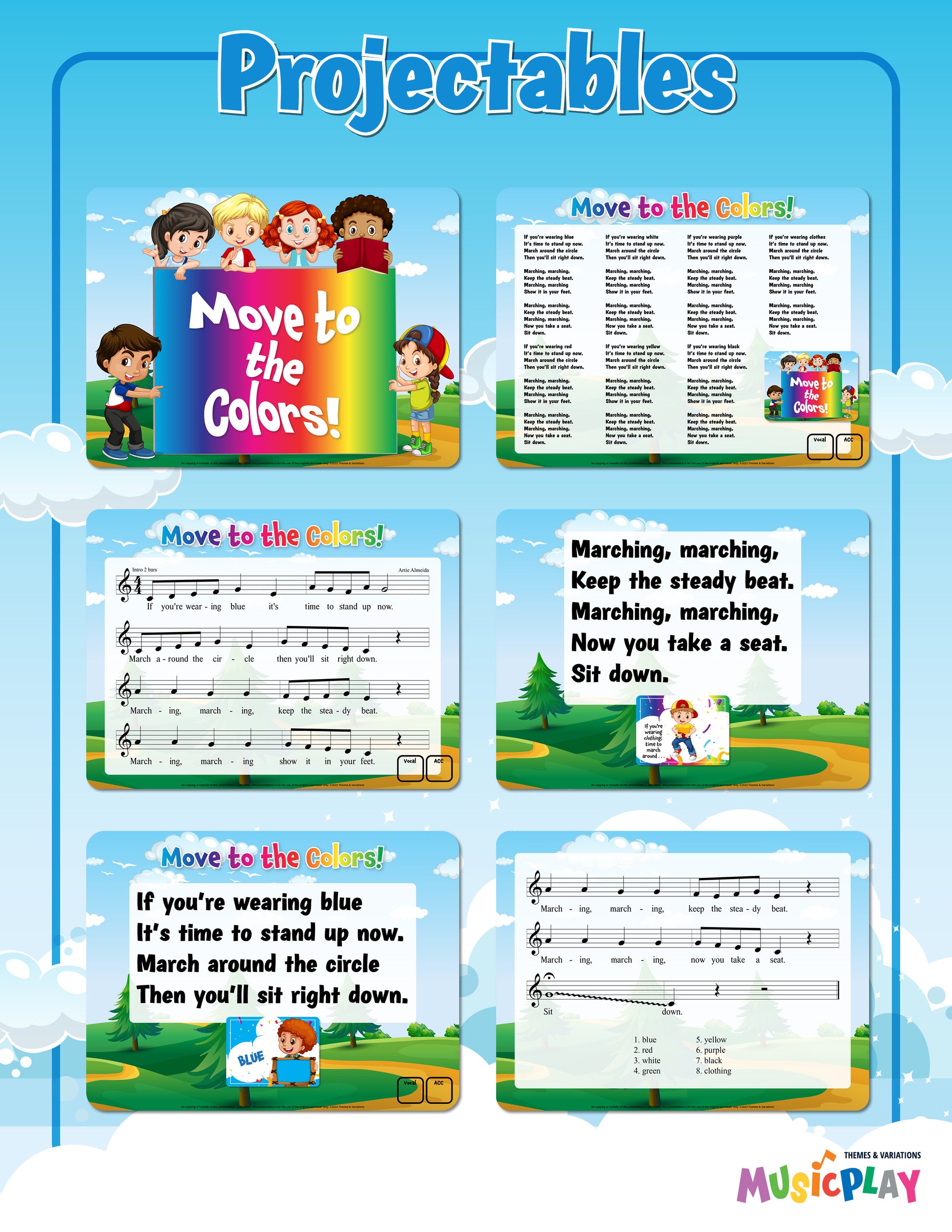 Grab your microphones, put on your walking shoes, and join together as a class with this fun and active singing unit. The collage of eleven songs gets the children up and moving around the room, then stopping to sing songs together. Eleven songs are in the initial recording, and you can add or substitute songs as you repeat the lesson throughout the school year.