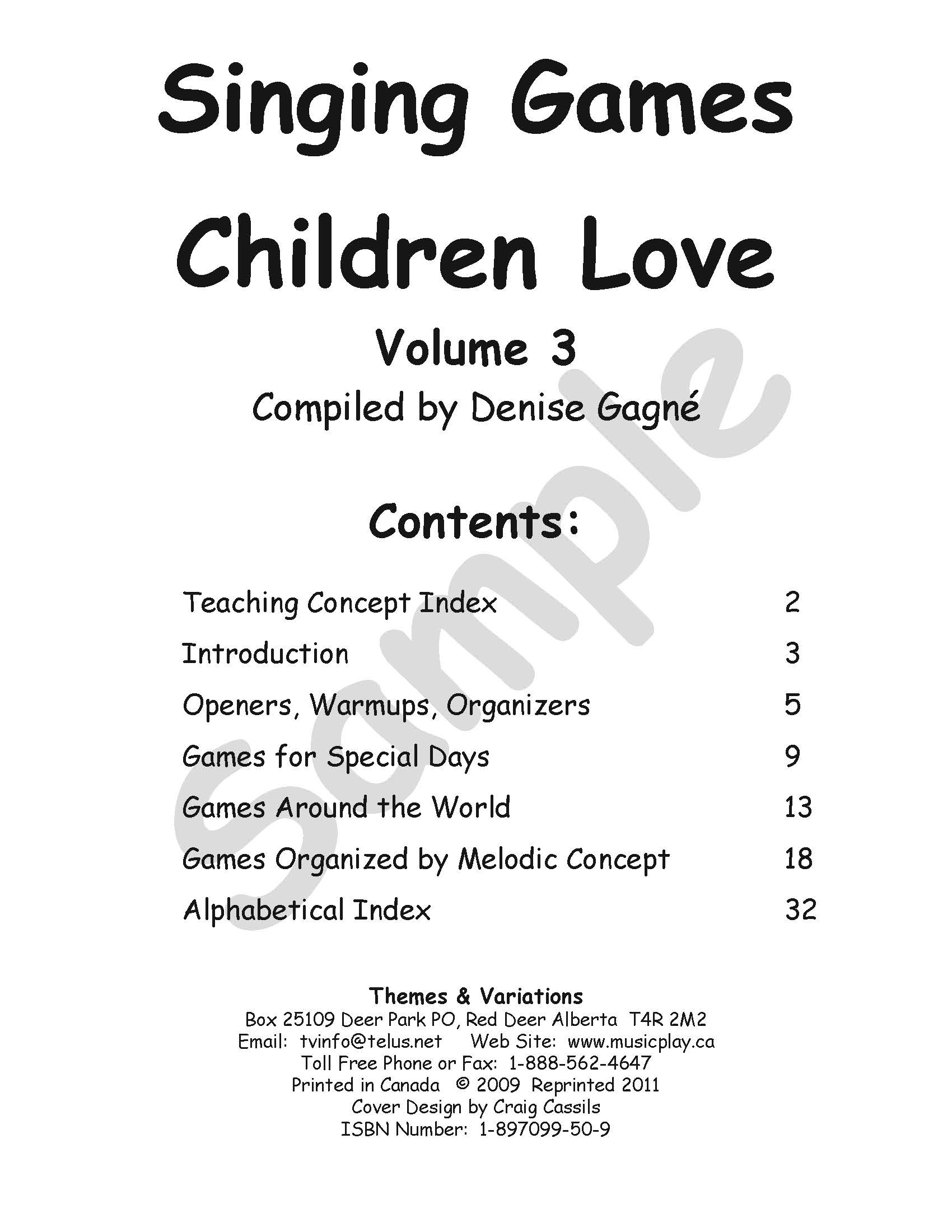 Singing Games Children Love Volume 3 has more than 50 singing games that PreK - Grade 3 children love to sing and play. A variety of singing games and activities are included: warmups and openers, traditional singing games from North America and around the world, original singing games, and games for special days. There are clap games, chase games, passing games, guessing games, and line games. The games are organized into three sections: Openers and Warmups, Games For Special Days, Games Around the World, and games organized by melodic concept. This is a useful collection for the teacher looking for activities to reinforce students' music reading abilities and for a game to enhance themes, seasons, or integrated learning.