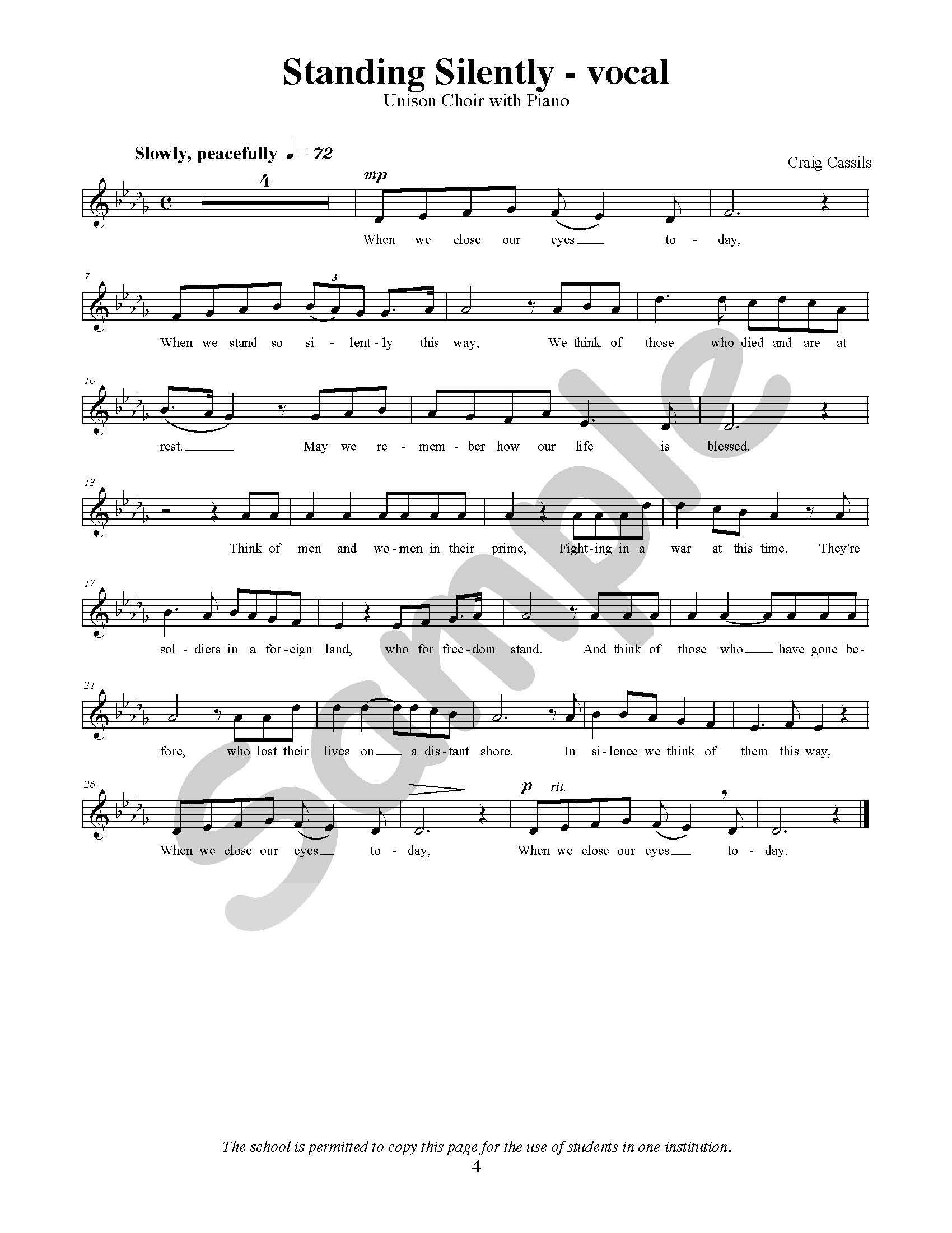 This is a unison choral arrangement of Standing Silently by Craig Cassils. This song is from the We Remember collection.