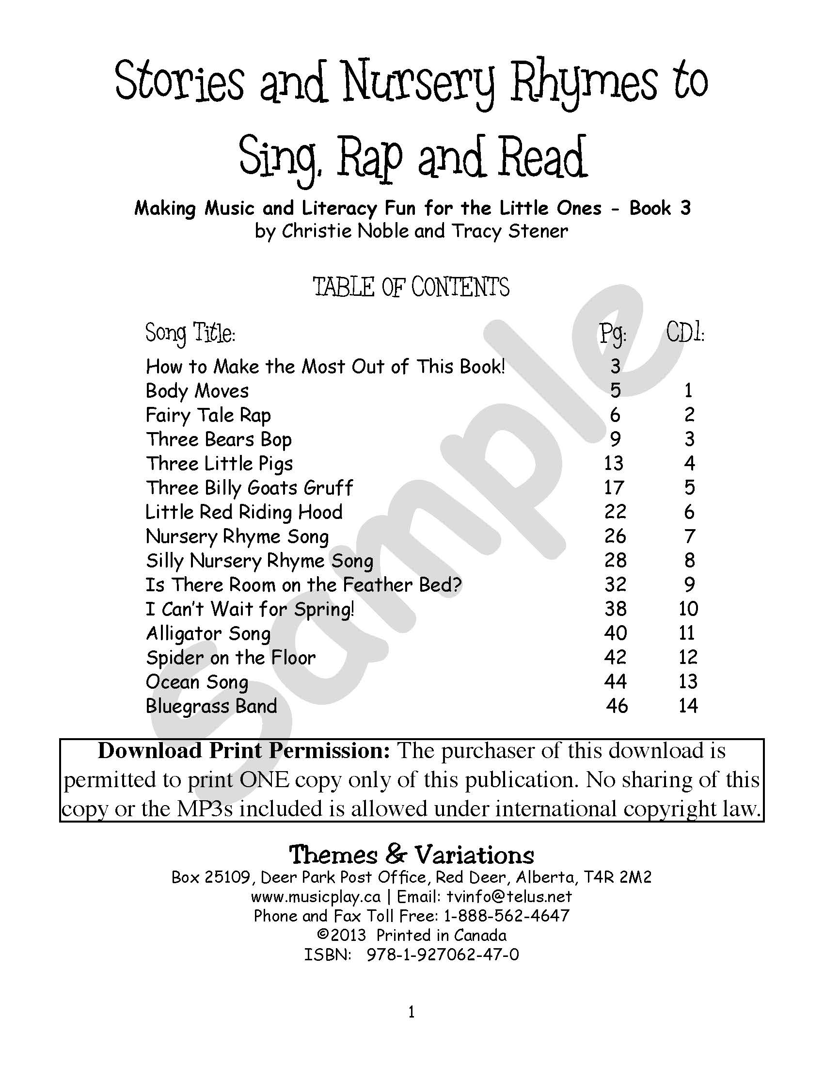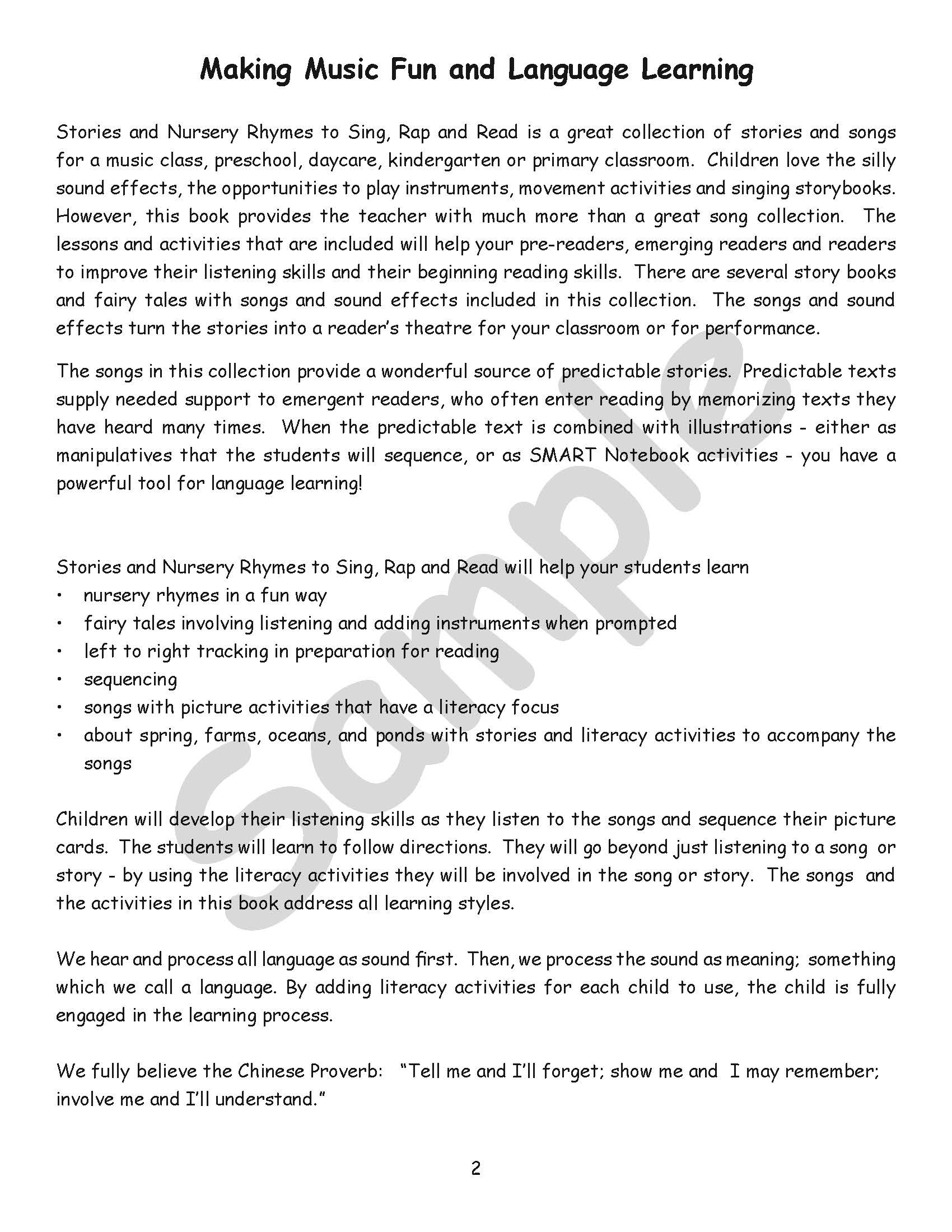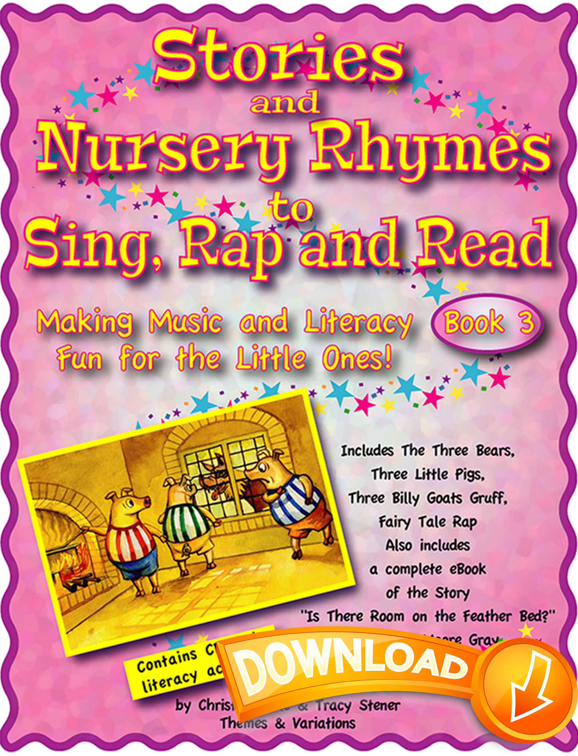 Stories and Nursery Rhymes to Sing, Rap and Read is a great collection of stories and songs for a music class, preschool, daycare, kindergarten or primary classroom. Children love the silly sound effects, the opportunities to play instruments, movement activities and singing storybooks.