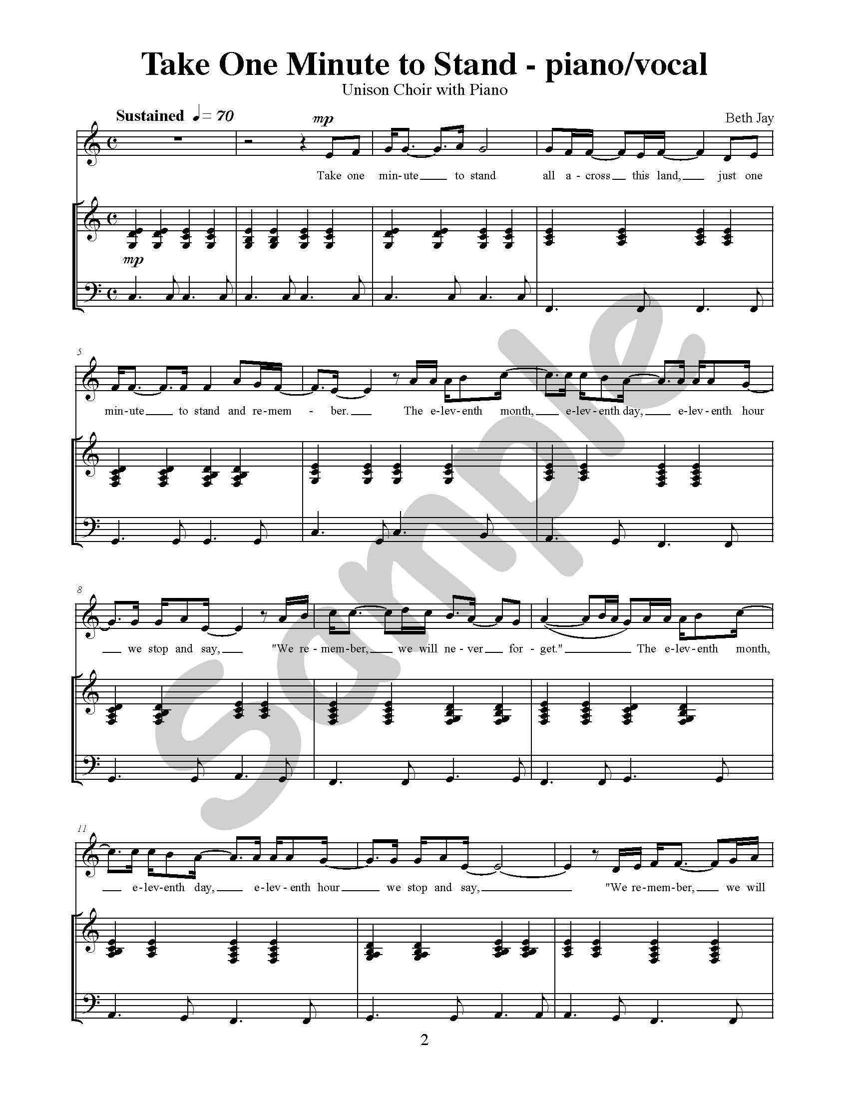 This is a unison choral arrangement of Take One Minute to Stand, by Beth Jay. This song is from the We Remember collection.