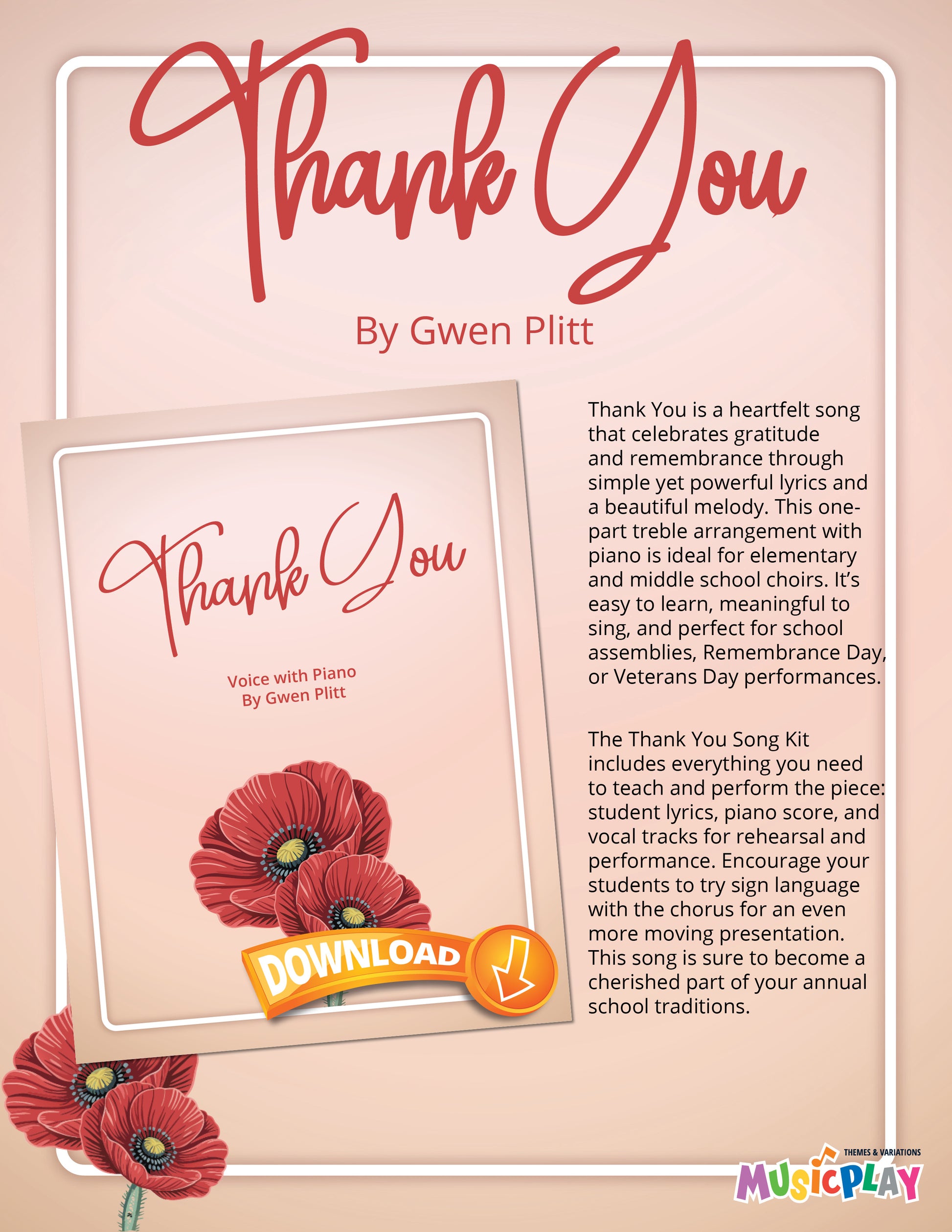 Thank You by Gwen Plitt is a heartfelt song that celebrates gratitude and remembrance through simple yet powerful lyrics and a beautiful melody. This one-part treble arrangement with piano is ideal for elementary and middle school choirs. It’s easy to learn, meaningful to sing, and perfect for school assemblies, Remembrance Day, or Veterans Day performances.