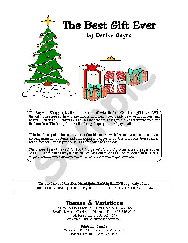 The Buymore Shopping Mall has a contest - tell what the best Christmas gift is, and WIN that gift! The shoppers have many unique gift ideas - toys, candy, new teeth, slippers, and baking. But it’s the Charity Bell ringer that has the best gift idea - a Christmas meal for the homeless. The best gift is one that brings hope, peace, and joy to all.