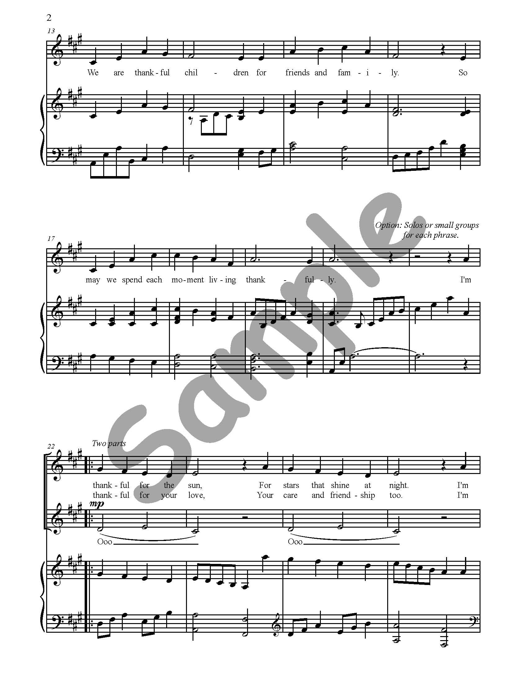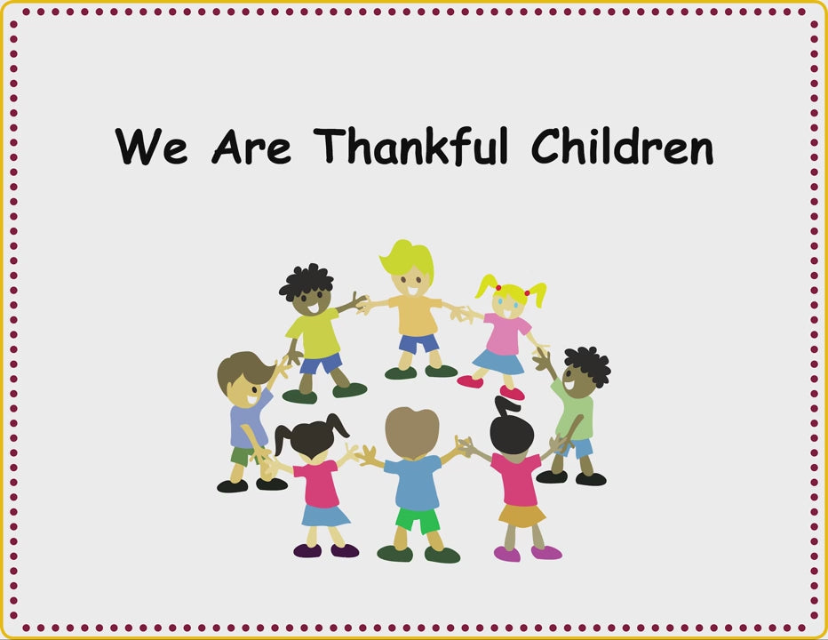 | We are thankful children for blessings great and small, We are thankful children for blessings great and small, I'm thankful for your love, We are thankful children for blessings great and small, May we spend each moment living thankfully. |
