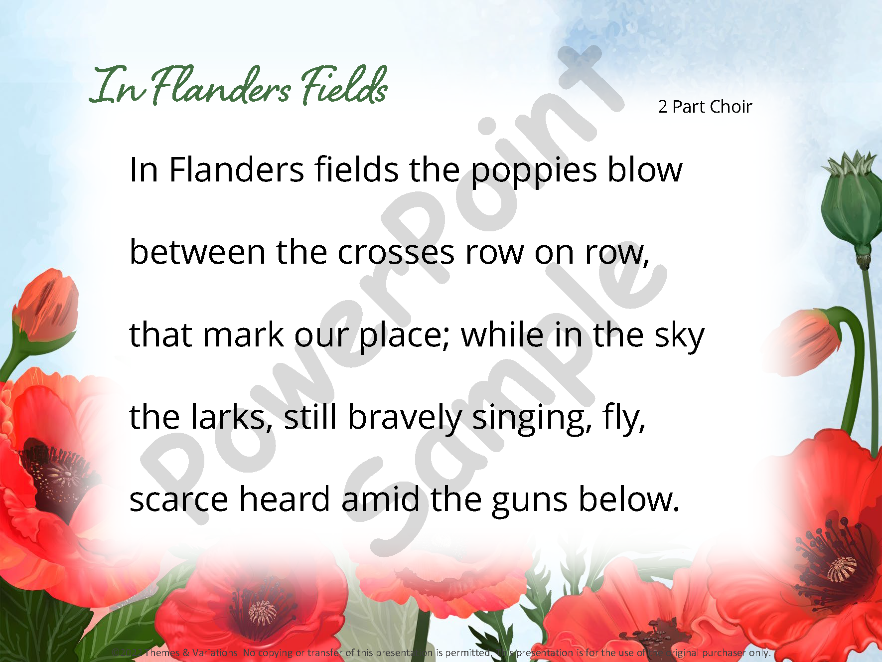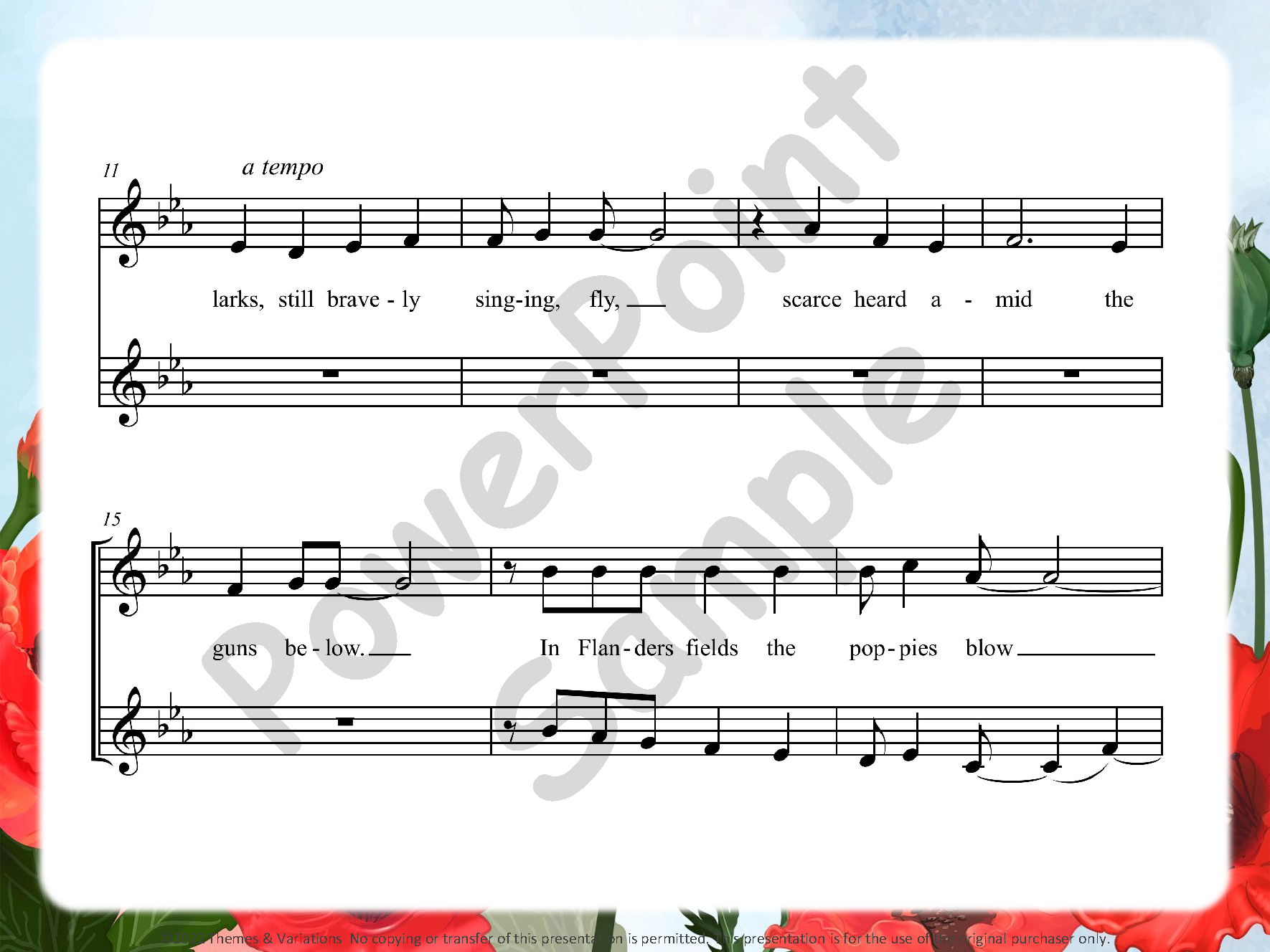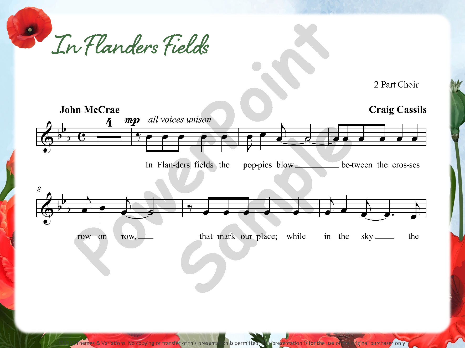 Your Remembrance Day/Veterans Day assembly will be easy to plan when you use the songs, poems, and quotes in this collection. The entire collection is beautiful and very singable for young classes or choirs. The songs will be a moving tribute to all veterans. The audio provided has beautiful orchestrations and vocals. The provided audio includes full performance, part 2 only (for 2-part songs), and accompaniment tracks.
