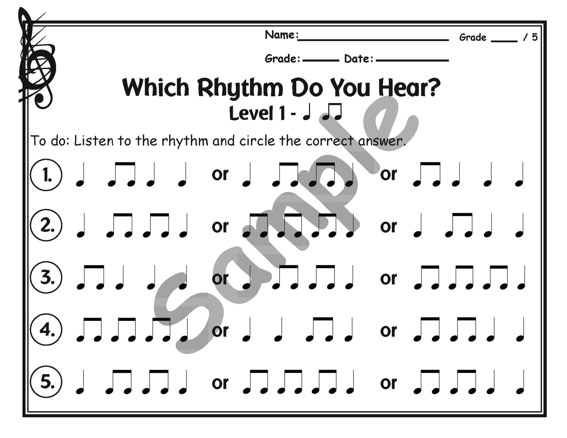 Which Rhythm Do You Hear is a great resource for teaching and assessing rhythm reading and writing for students from K - Gr. 5. There are twelve levels available so that you can tailor this activity to each class. Each level focuses on one type of rhythm. As the students become familiar with the basic rhythms by using the projectable and assessment worksheets, they will progress to dotted, syncopated, and triplet rhythms. The activities included will give you many opportunities to assess your students’ ability to feel the pulse, read rhythms and subdivide, and notate rhythms. Included are projectable PPTs for every level, projectable Assessment PPTs, and assessment worksheets.